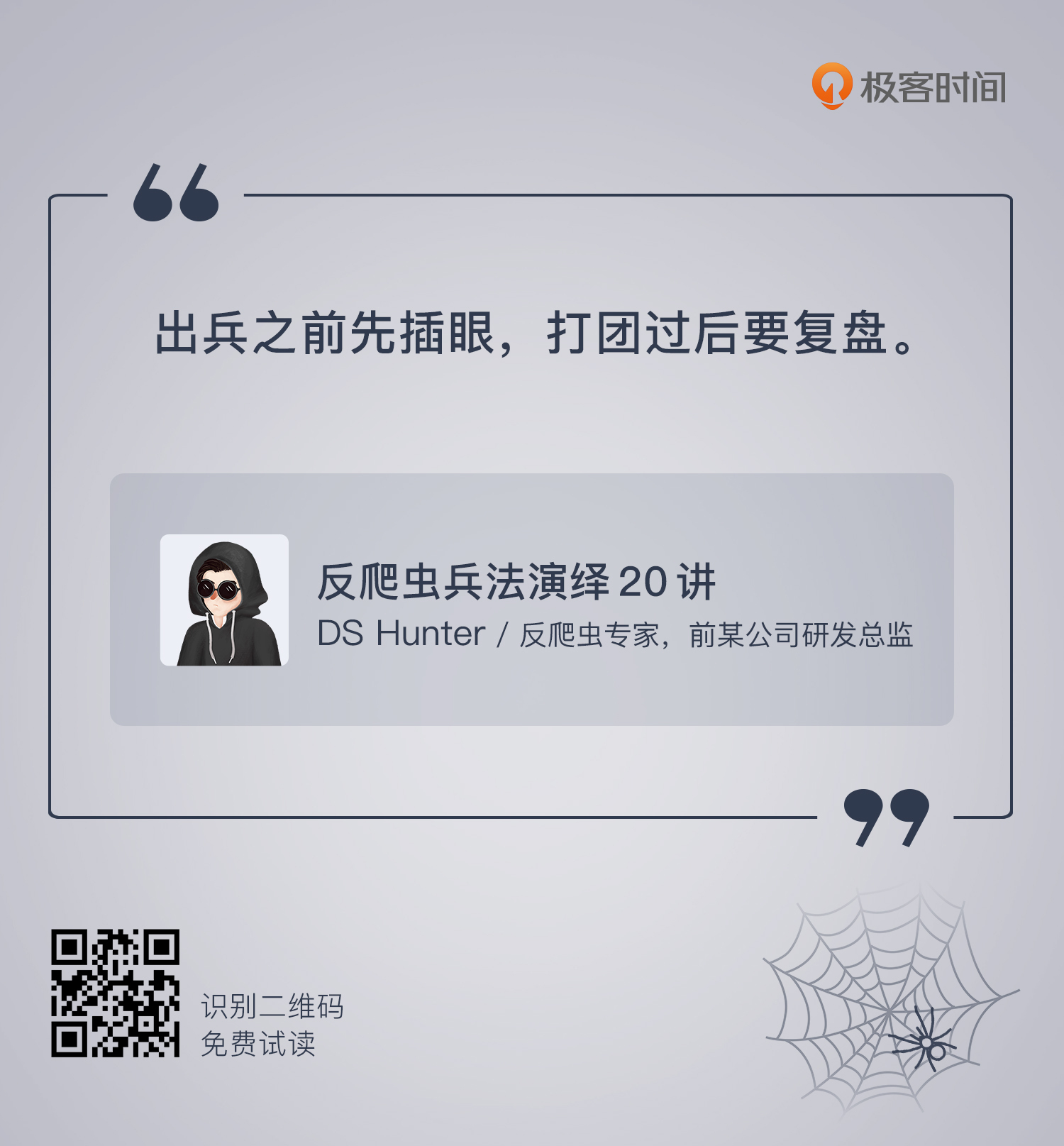 我在01讲中,就强调过信息一直是战争的核心,而信息收集是反爬虫的重中之重。公司有爬虫的需求,是希望在信息战中取得胜利,进而赢得商业的战争。而反爬虫方“收集信息”需求的产生,是由于工程师们想在反爬虫这场战争中打赢。