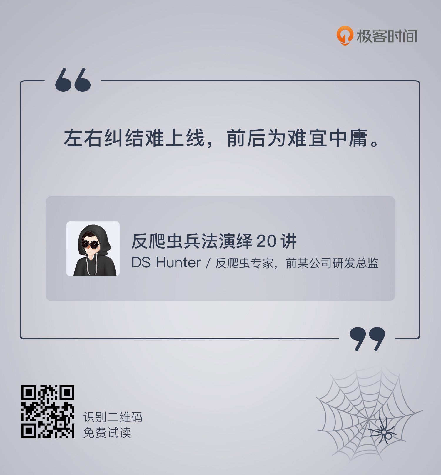 那么,到这里为止,我们的理论课就告一段落。下一讲,我会带你从头到尾走一遍反爬虫的过程,认真观察这个战场的每个角落。
