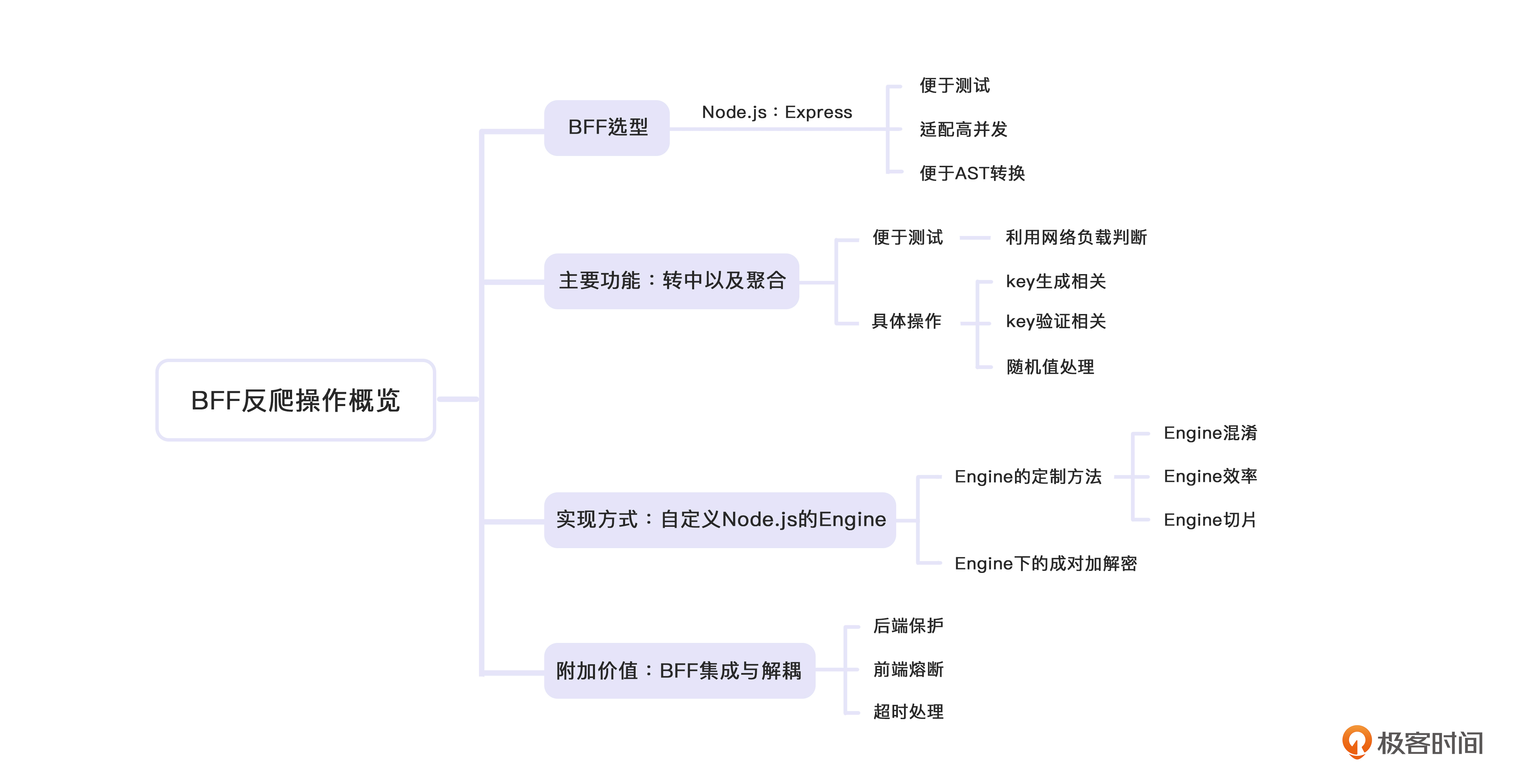 今天这一讲,我们了解了BFF在反爬虫动作中的一系列问题。从选型开始,到实现反爬虫的详细动作,以及实现反爬虫功能的详细方式都做了详细的讲解。最后,我们也补充了BFF在集成和解耦上面的附加价值。详细的内容我也给你准备了一张脑图,你可以对照着来复习。