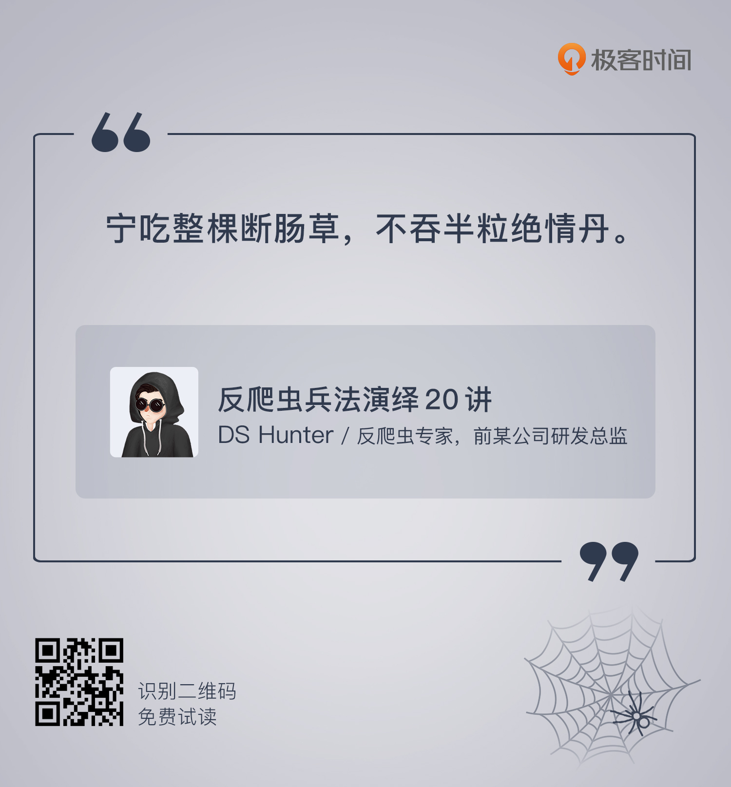 前面,我们讲了反爬虫的前置操作,例如快速下线的保命技巧,key生成的相关知识。那么这一讲,我们就谈谈反爬虫最终的核心诉求:验证爬虫。