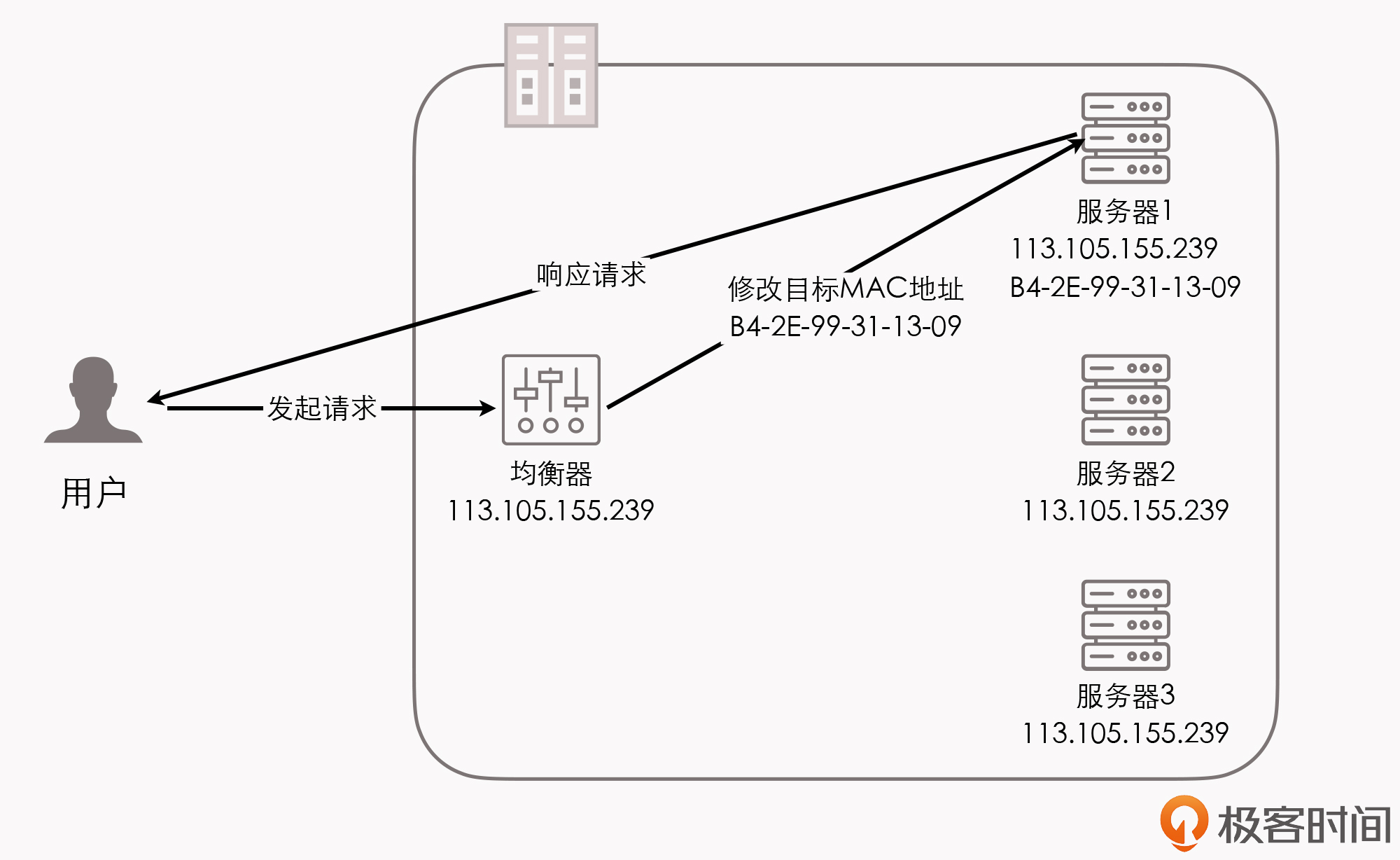 数据链路层负载均衡所做的工作,是修改请求的数据帧中的MAC目标地址,让用户原本是发送给负载均衡器的请求的数据帧,被二层交换机根据新的MAC目标地址,转发到服务器集群中,对应的服务器(后面都叫做“真实服务器”,Real Server)的网卡上,这样真实服务器就获得了一个原本目标并不是发送给它的数据帧。