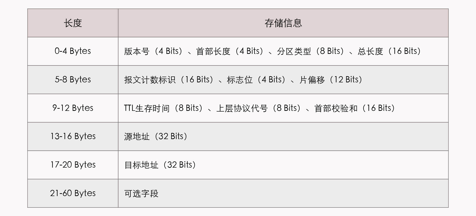我拿IP协议来给你举个例子吧。一个IP数据包由Headers和Payload两部分组成,Headers长度最大为60 Bytes,它是由20 Bytes的固定数据和最长不超过40 Bytes的可选数据组成的。按照IPv4标准,一个典型的分组数据包的Headers部分的结构是这样的: