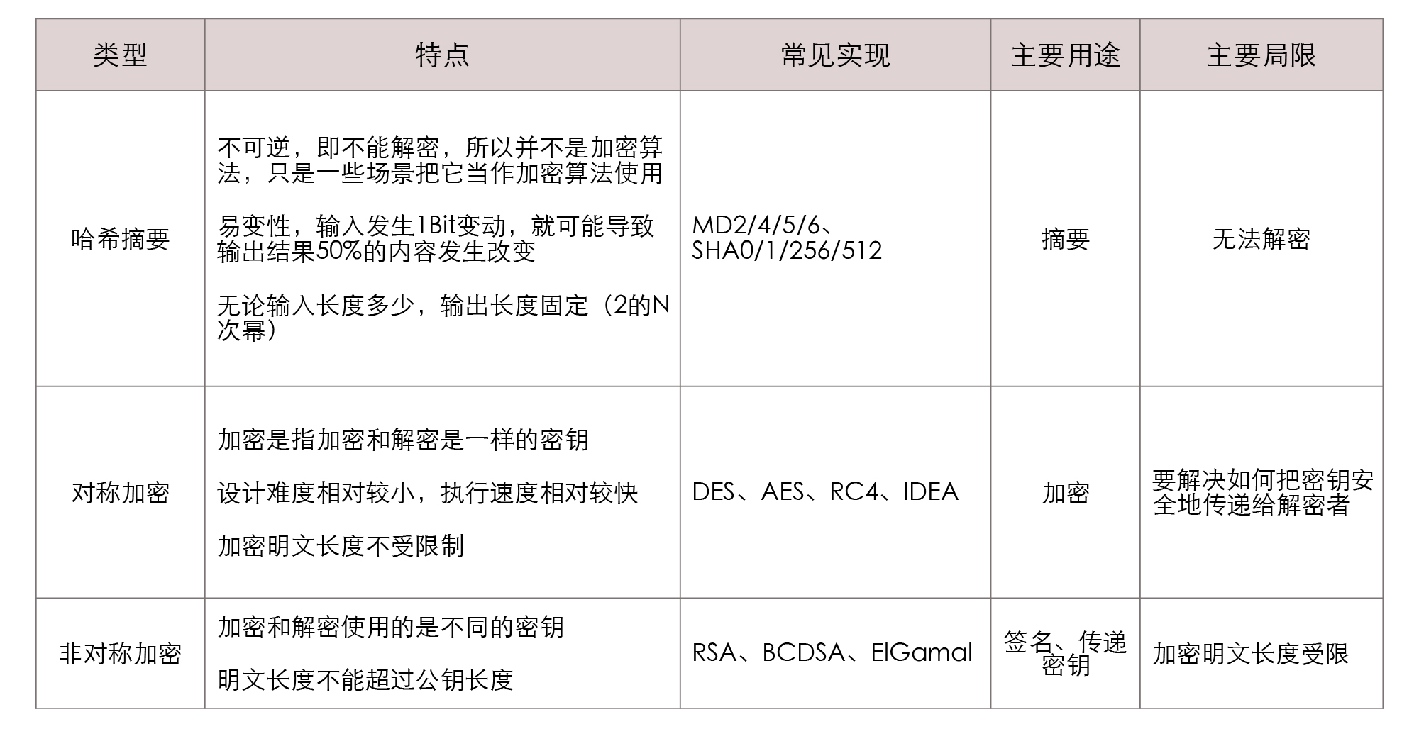 这里,我也汇总了前面提到的这三种与密码学相关的应用,你可以参考下表格,去深入理解它们的主要特征、用途和局限性: