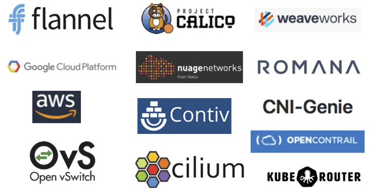 要知道,提出容器网络标准的目的,就是为了把网络功能从容器运行时引擎、或者容器编排系统中剥离出去,毕竟网络的专业性和针对性极强,如果不把它变成外部可扩展的功能,而都由自己来做的话,不仅费时费力,还不讨好。这个特点从下图所列的一大堆容器网络提供商就可见一斑。