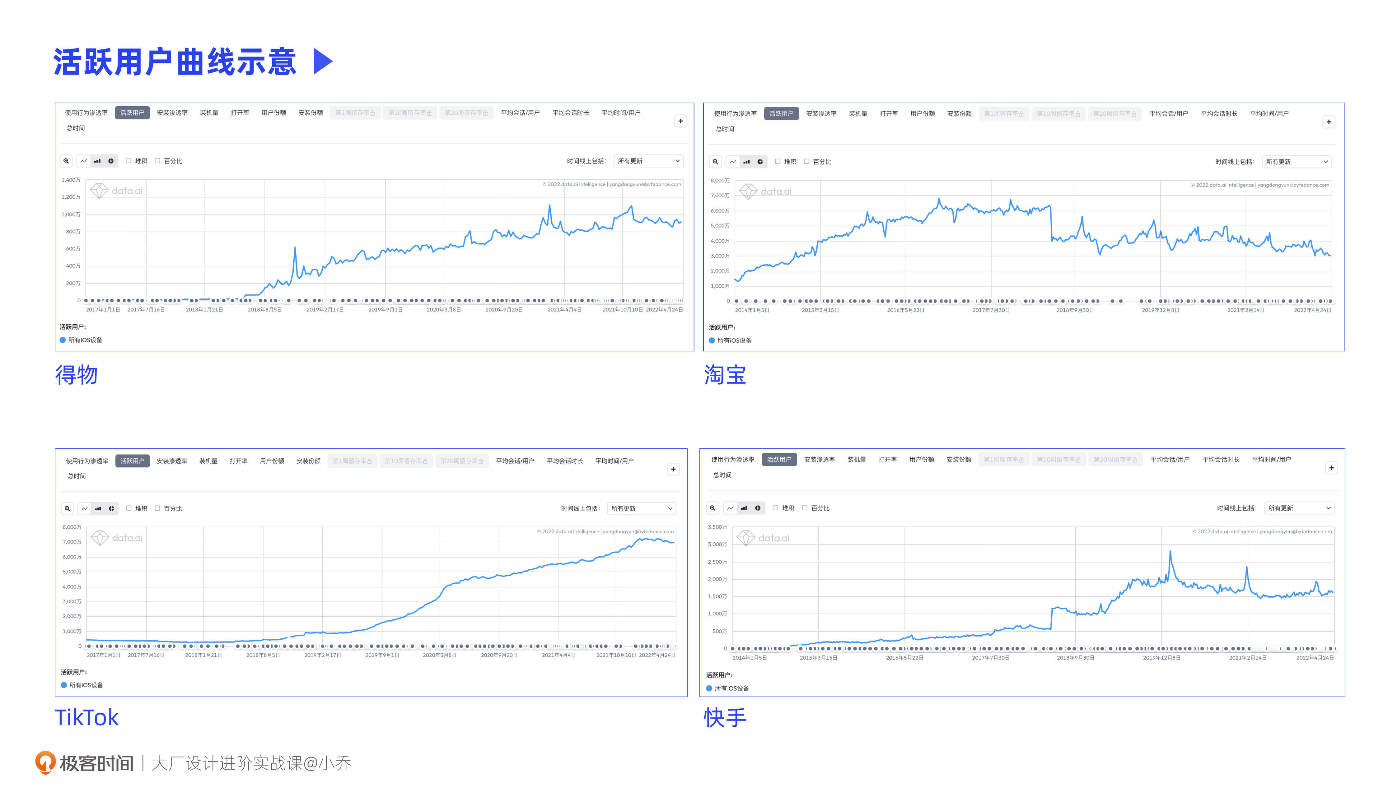 通常在创业团队中,我们都比较清楚业务所处的阶段。但在引入期过后,随着企业或部门的壮大,尤其在一些大厂,团队架构庞大复杂,职能划分细碎,设计师接收到的信息较少,许多同学会不清楚业务所处的阶段。我们可以通过一些数据平台,通过查看活跃用户数的曲线趋势来判断。