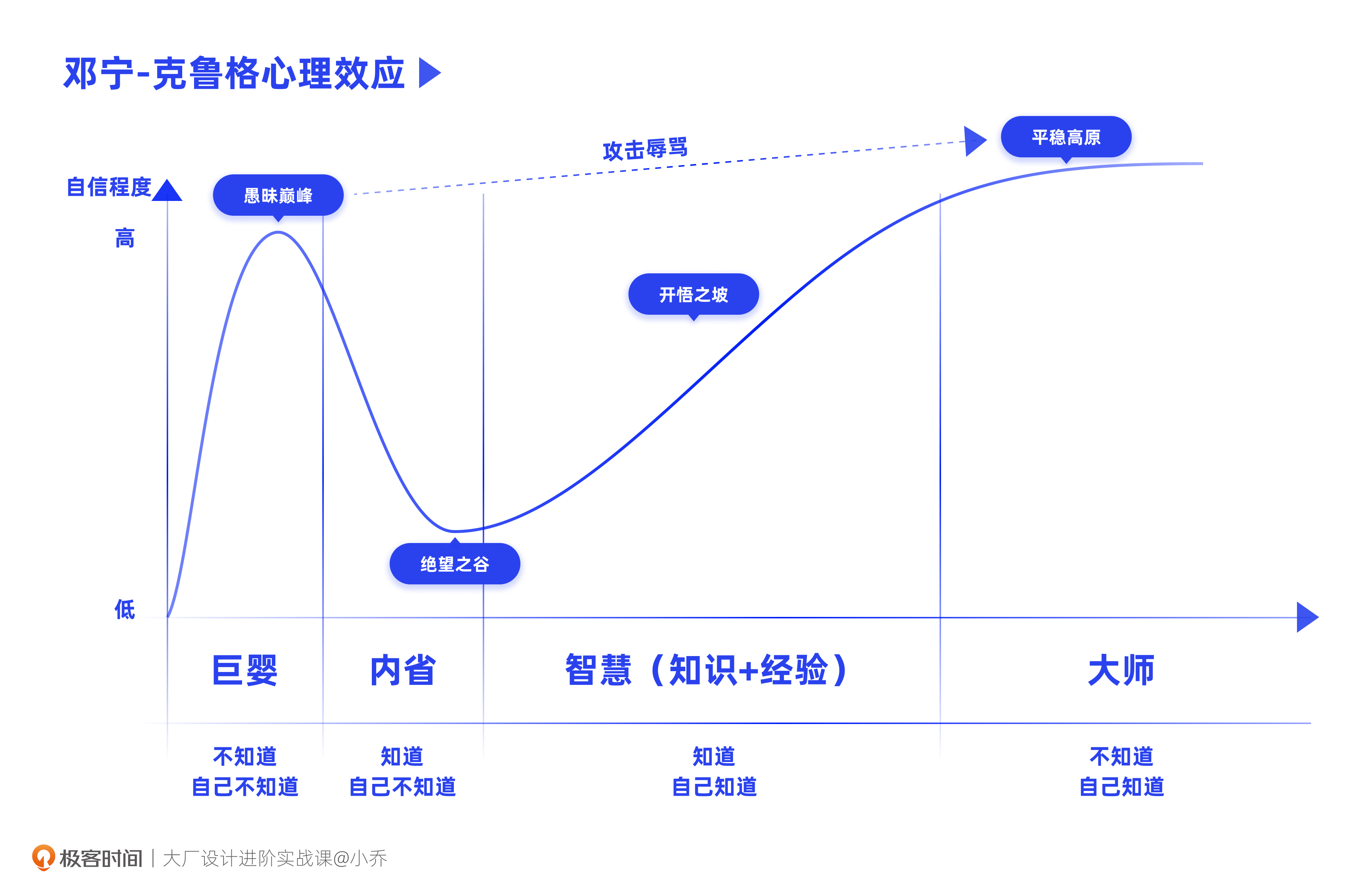 在说清这个问题之前,我想先向你介绍邓宁-克鲁格心理效应。在我们还是半瓶子新手时,往往不知道自己不知道,会因为盲目自信,拒绝吸收知识;而当我们内省后发现自己其实并不知道,就会踏上开悟之坡,通过积累知识和经验获得迅速成长;而当我们知道得越多,感受到了山外有山,就会越发谦逊。所以真正的大师,总是儒雅谦和的。