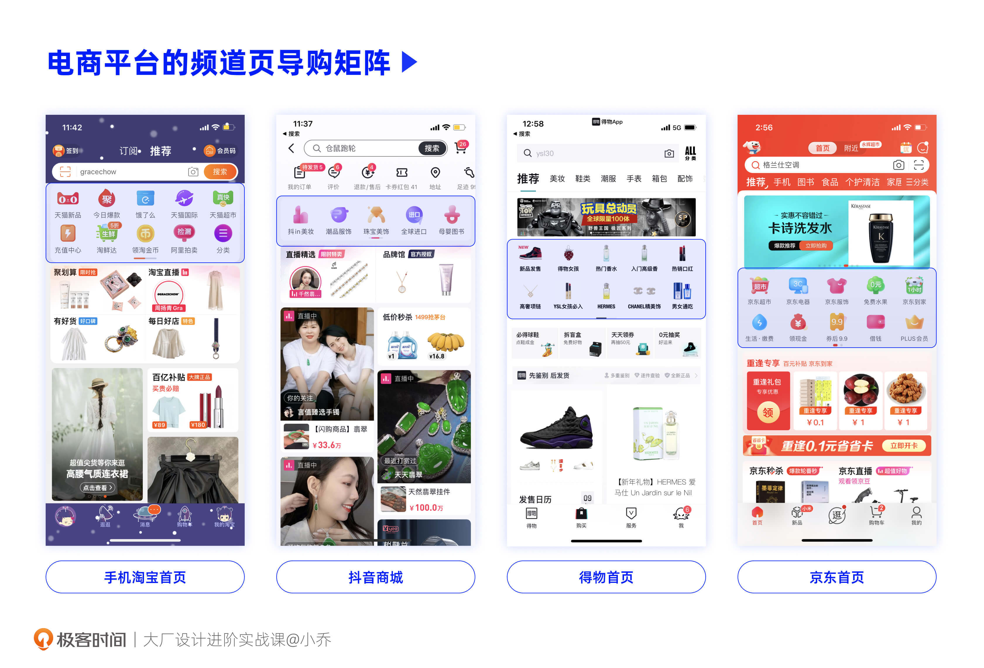 以电商行业为例,从成长期至成熟期,企业都会对核心场景、核心人群、核心品类进行重点精细化运营,也就是行业中常说的“人-货-场”。比如淘宝、得物、抖音电商等平台,都有频道页导购矩阵,根据平台特性,主打适合自己的品类、人群和场景。