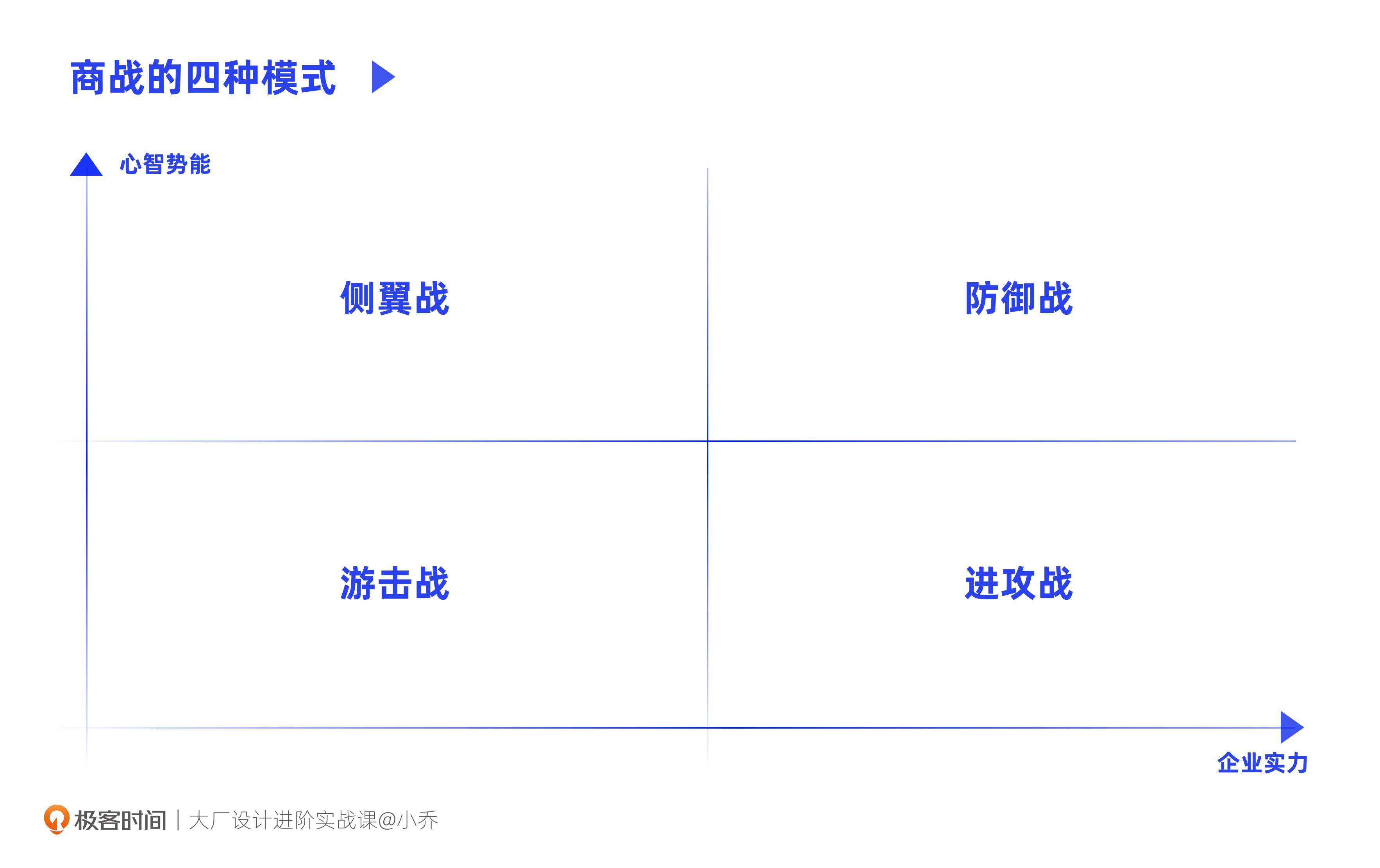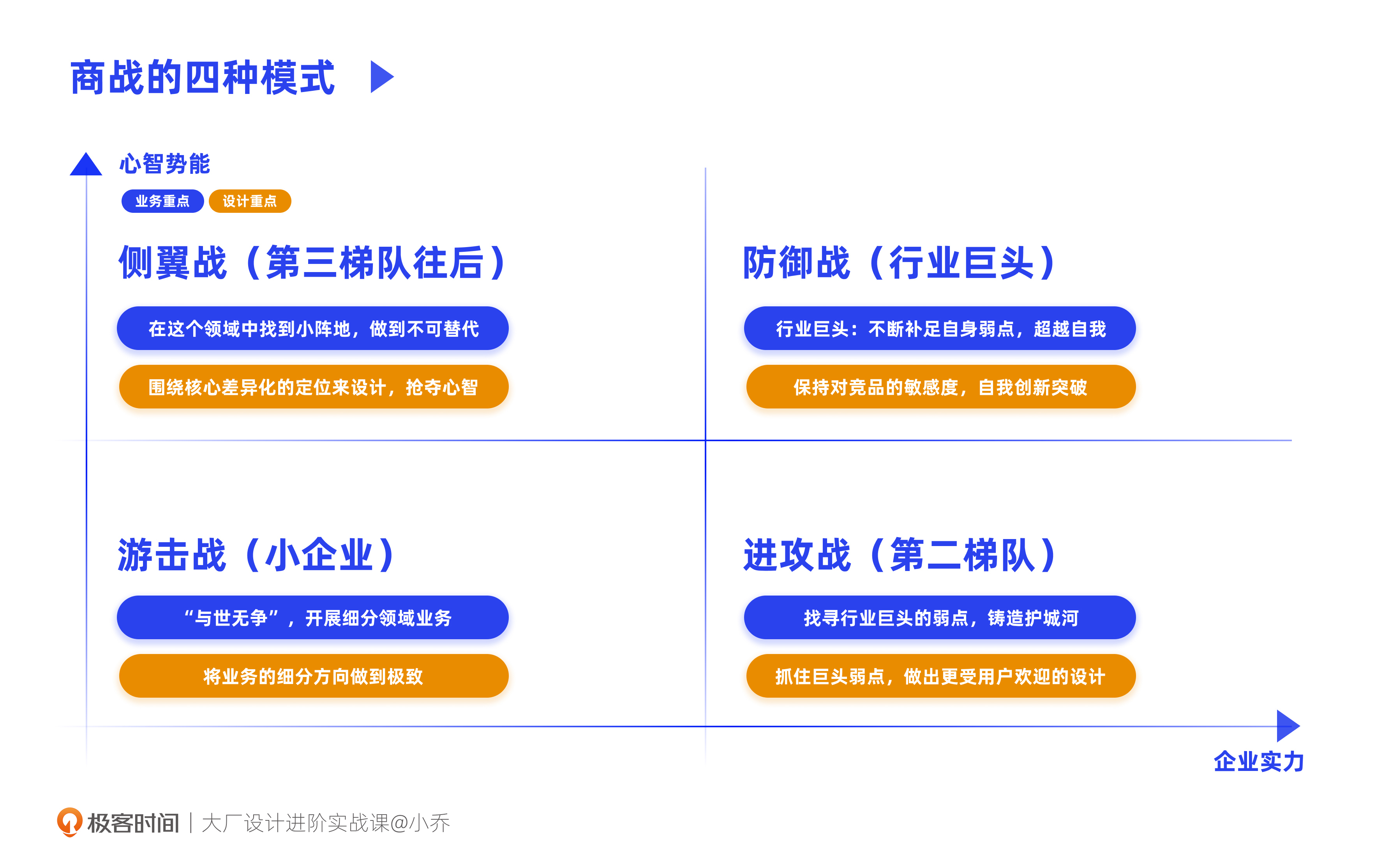 这节课,我们就以这4种商战方式为基础,一起探讨根据不同的企业实力、业务加入时机和市场地位,业务分别应当采用哪种方式取得商战的胜利,而我们设计师,又该如何以设计推动业务,突出重围。