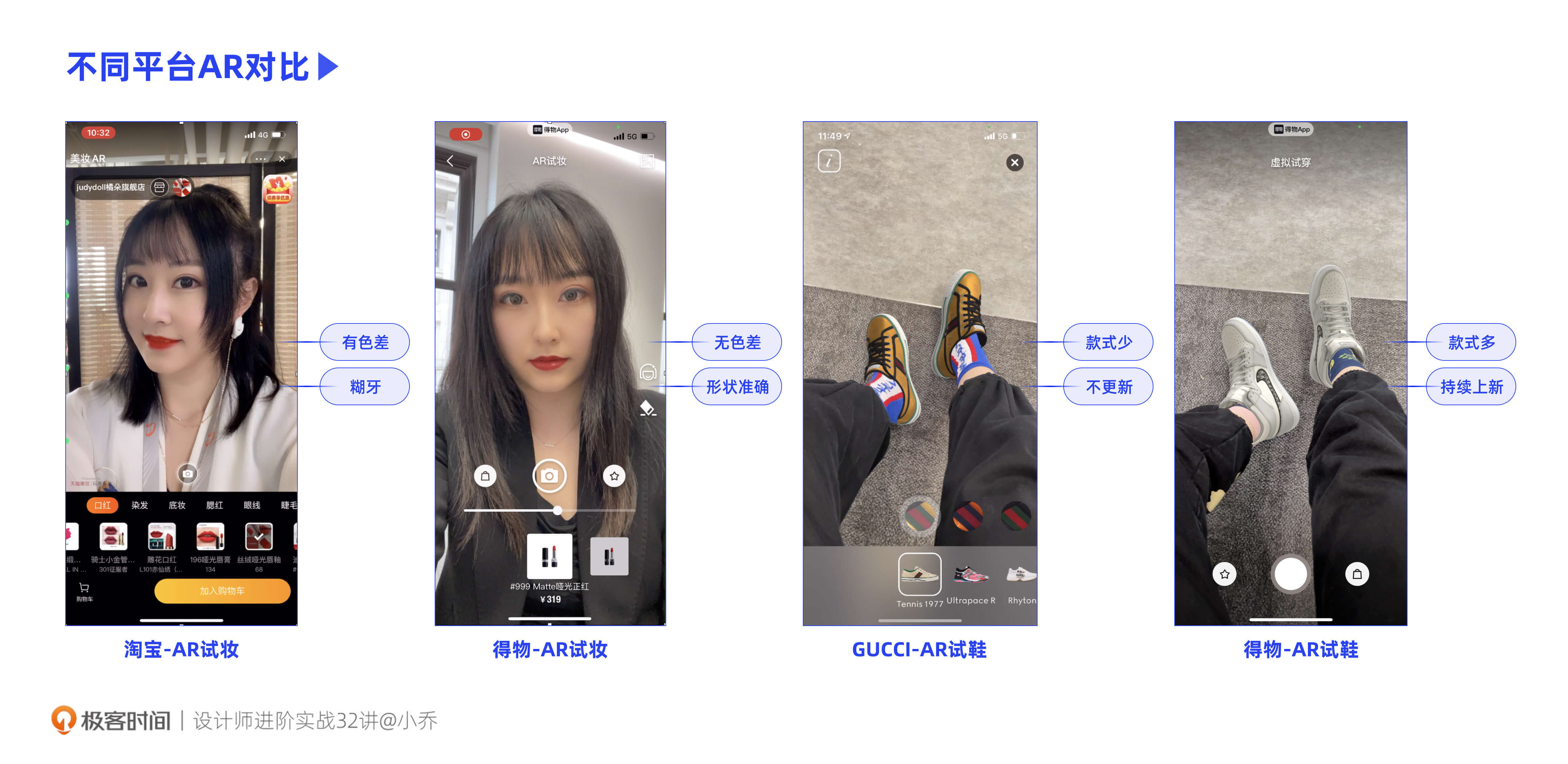 我们还可以横向对比一下各电商平台做AR的思路。根据业务目标不同,各企业对于AR的使用手法也是大相径庭的。