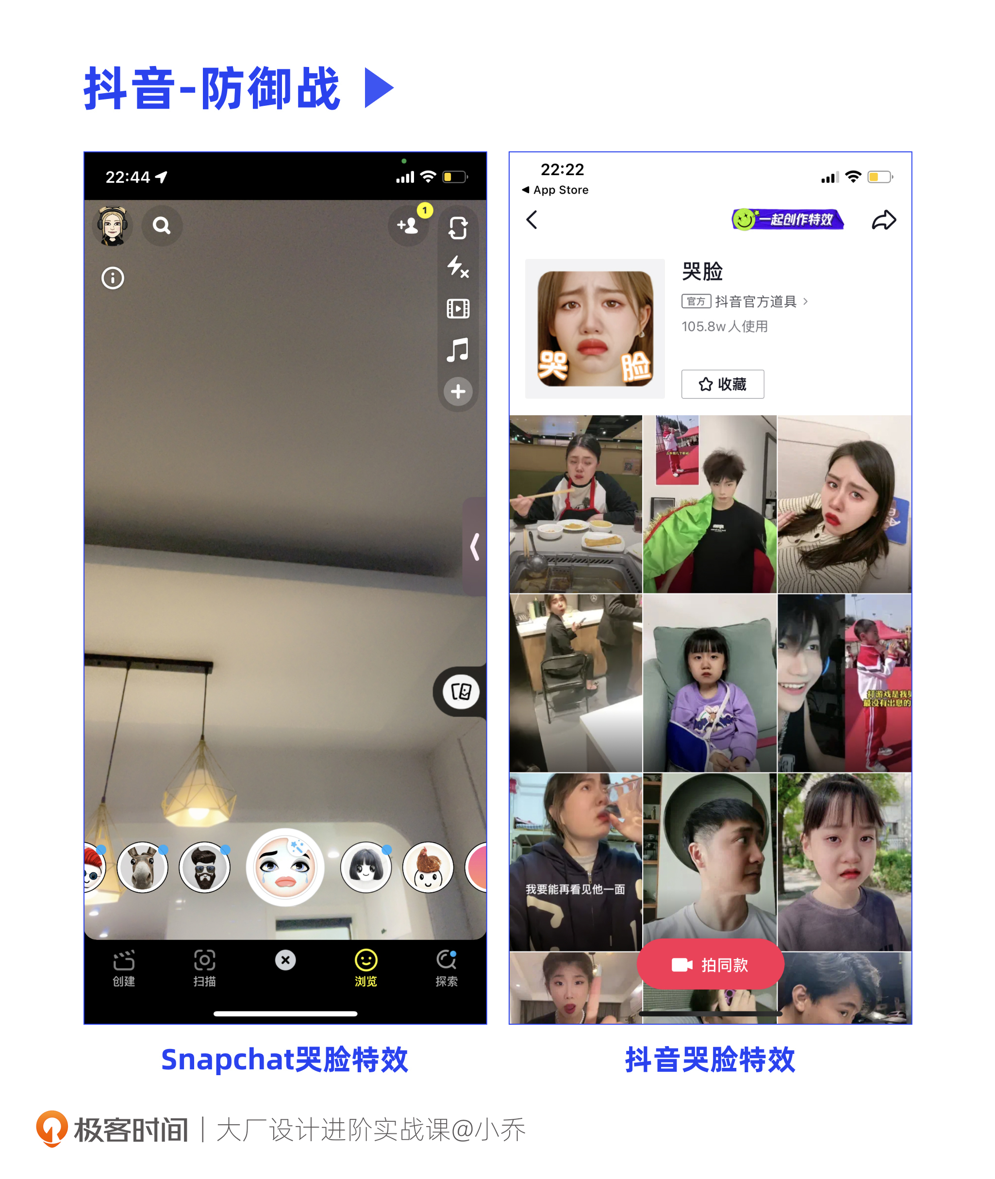 Snapchat经过这一特效的发酵,迅速成为App Store下载排行榜第一名。面对Snapchat在国内的突然兴起,抖音设计师也迅速响应,在一周内推出自己的哭脸特效,成功抵御了其他产品的进攻。