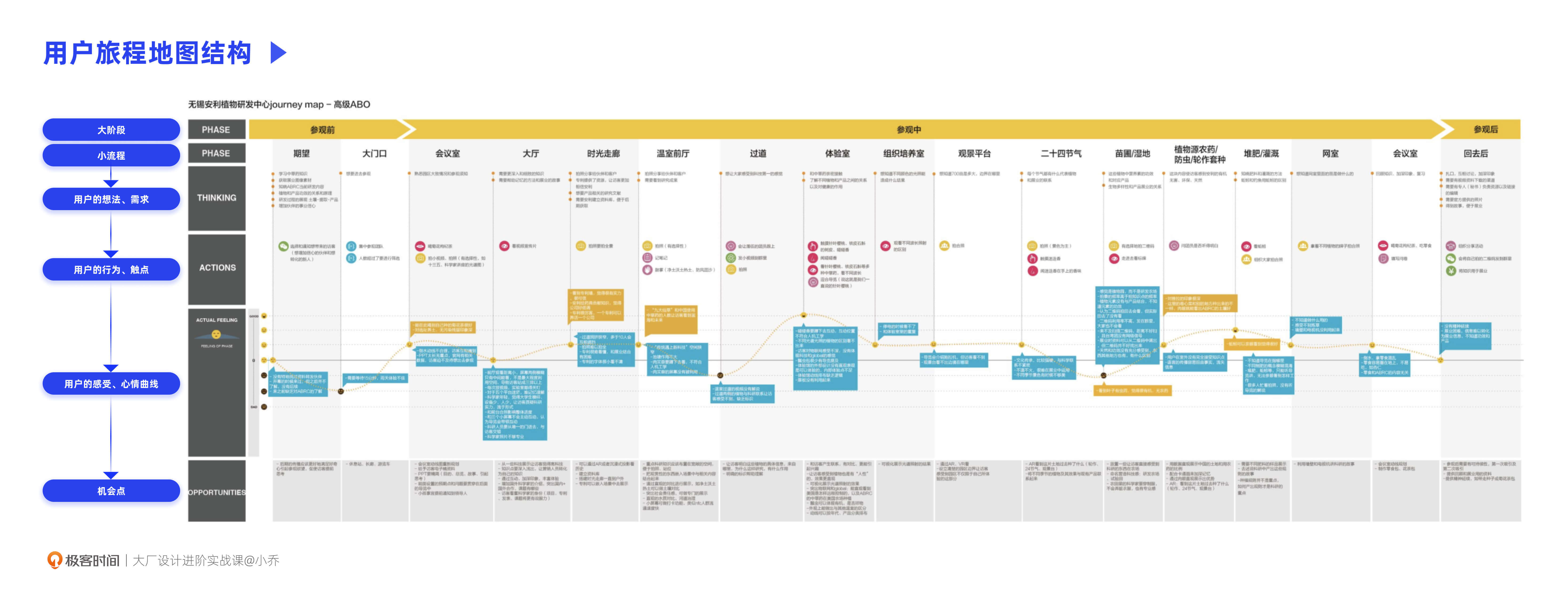 用户旅程地图可以帮助我们排查流程缺口、获得全局视角、精细化服务好不同用户类型。在绘制用户旅程地图之前,需要提前完成用户调研和Persona的梳理,鼓励其他职能的同事与我们共创完成。在梳理机会点时,先根据图中的痛点梳理优化方案,再全盘回顾一遍,将峰值体验和业务知识融入进去,使价值最大化。