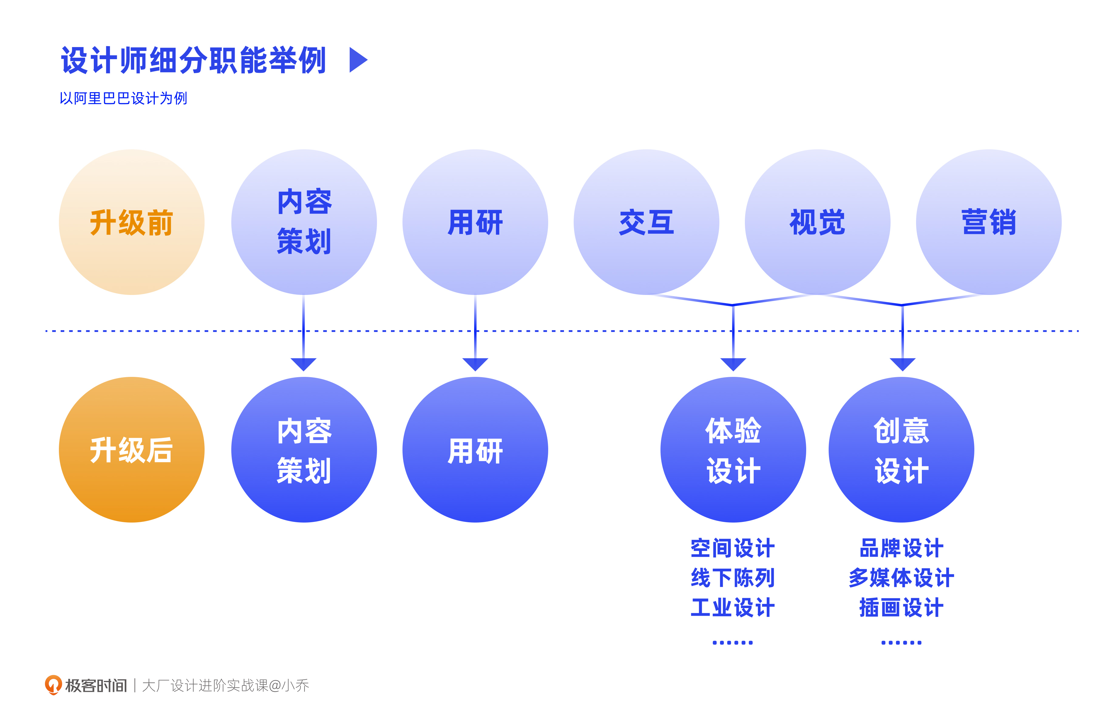 早在2017年,阿里就在进行设计师职能升级规划。在2018年就去除了交互和UI的分工,要求设计师全链路,将原本的交互、UI、工业设计、建筑设计、线下陈列设计等都称为“体验设计”,也就是大家常说的UX;而原本的营销视觉、插画、多媒体、品牌设计等合并为“创意设计”。不管是体验设计师还是创意设计师,都需要懂业务,有逻辑,而非停留在手活技法阶段。