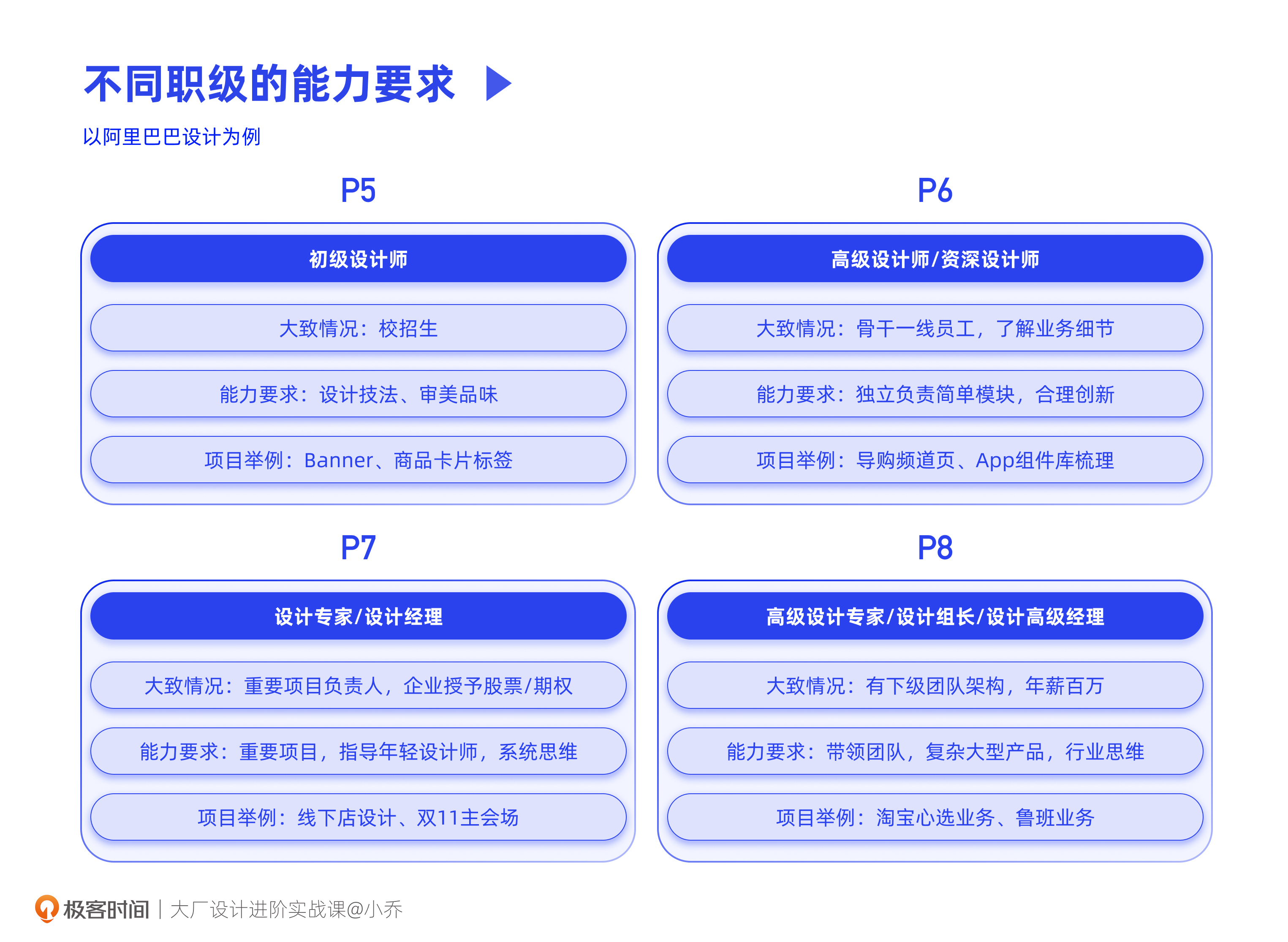 因此,想要获得能力的晋升,首先要横向对比行业头部企业的要求,跟上时代的变化,而不是固步自封,停留在原本的价值观里。再来,也需要纵向看待不同职级的要求,只有清楚往上晋升需要具备的能力,才有努力的方向。