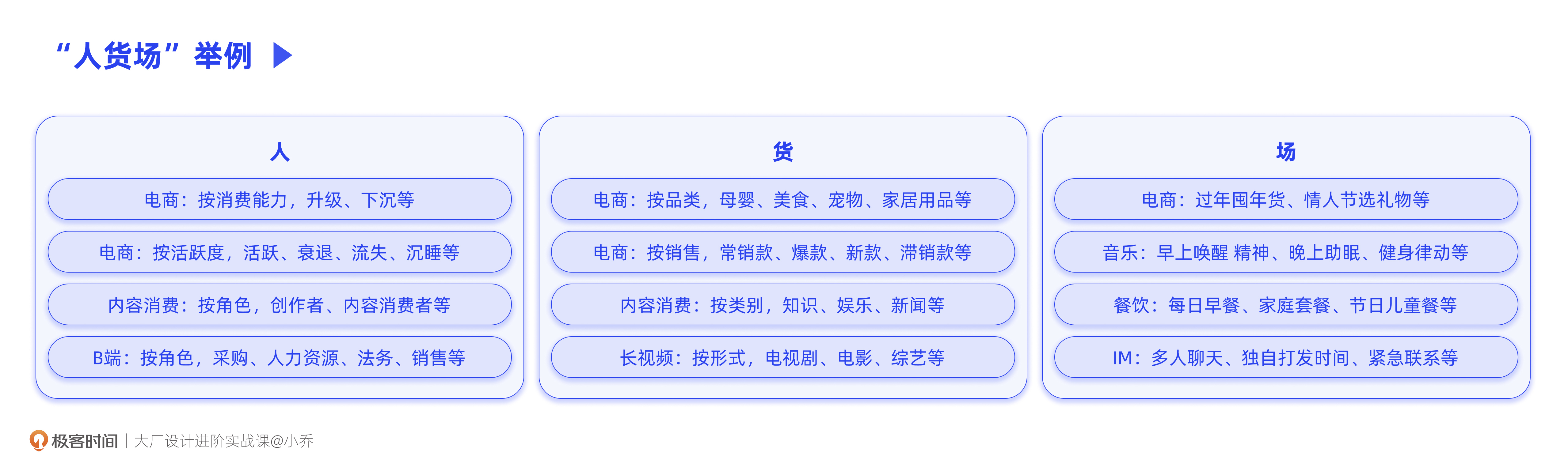 “人”,指的就是各种类型的用户,根据不同维度的条件,用户可以被归纳为不同类型;“货”,就是不同类型的内容或商品;“场”,就是多样的场景。如下图中的举例所示: