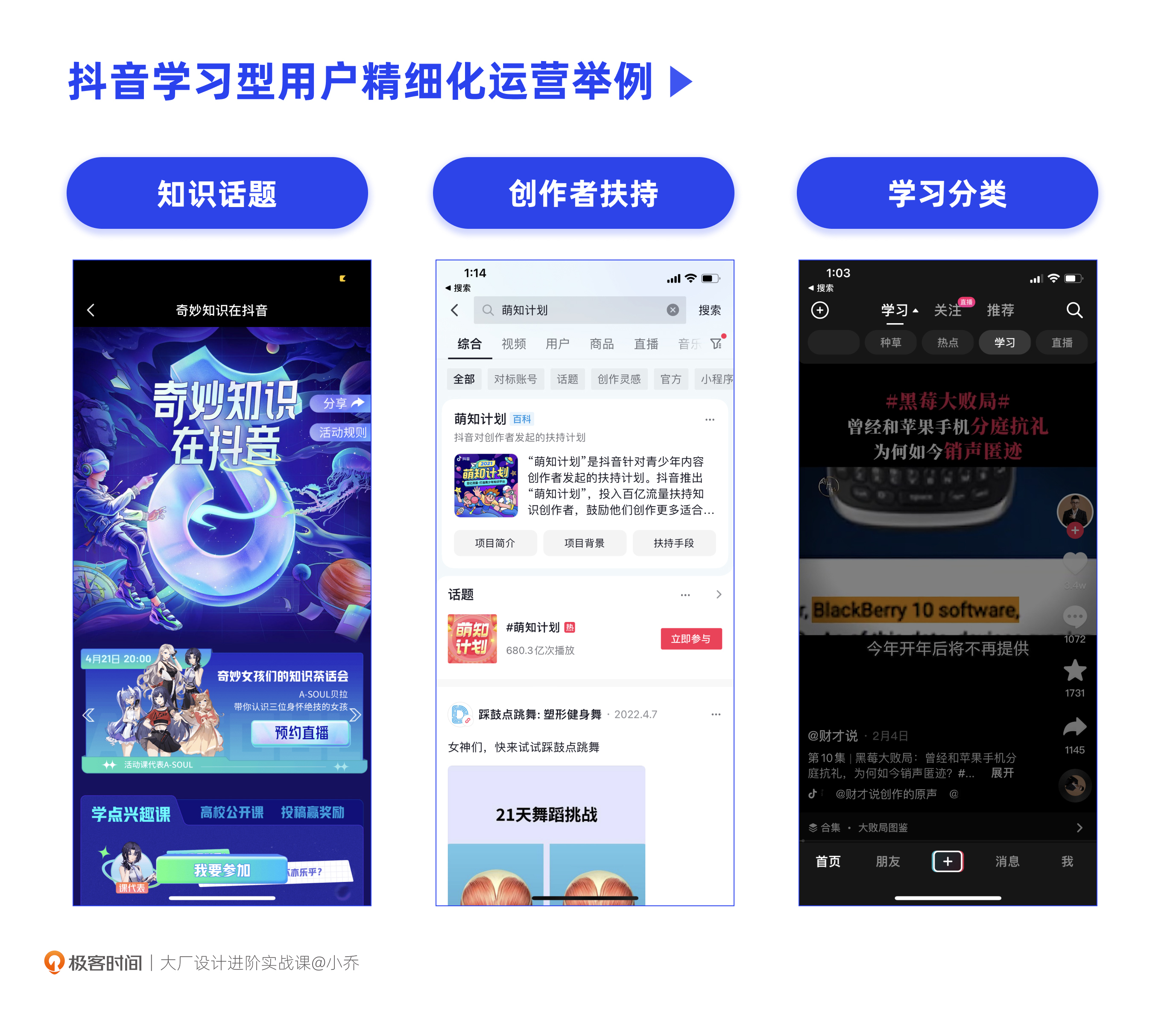 比如有一类用户是学习型,希望通过碎片时间吸收知识,不想看到跳舞的小姐姐。此时从内容运营角度,就可以引入知识消费内容,发起更多知识类挑战;从创作者角度,需要给予创作者更多的流量扶持,让他们愿意入驻,形成我们之前讲过的UGC增长Loop;从产品功能角度,就可以把学习模块或频道页单独规划。抖音也确实如下图所示,从多角度做了许多运营动作。