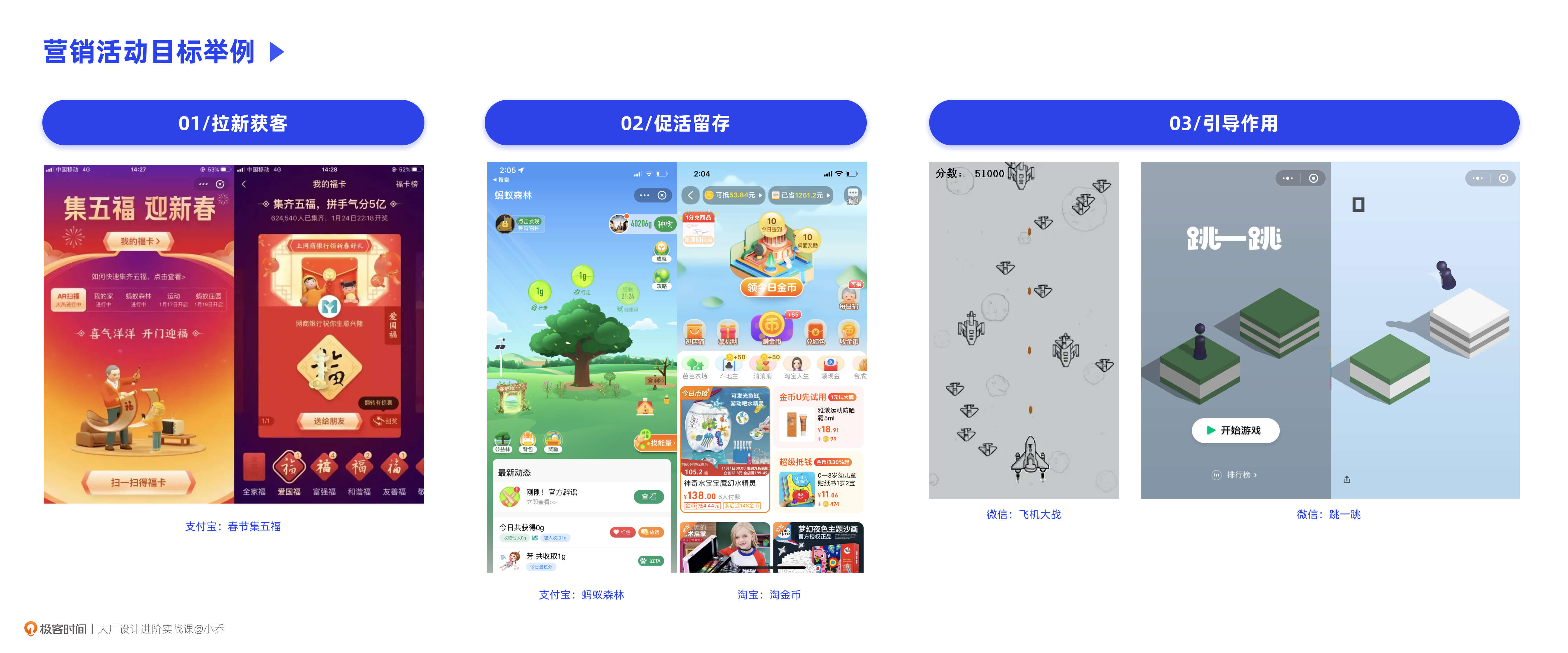 目前市面上的营销活动,往往是既有物质激励,又有精神激励的。并且随着营销活动的日渐成熟,运营活动框架已经形成了范式,通常上面一半是游戏,而下面一半是任务列表或任务入口。如下图所示,支付宝蚂蚁森林、天猫双11游戏、抖音春节活动、拼多多签到、淘宝淘金币等,都符合范式结构。这样的效果是,用户一边在游戏中获得快乐或物质奖励,一边又可以帮助企业完成本次营销活动的项目目标。
