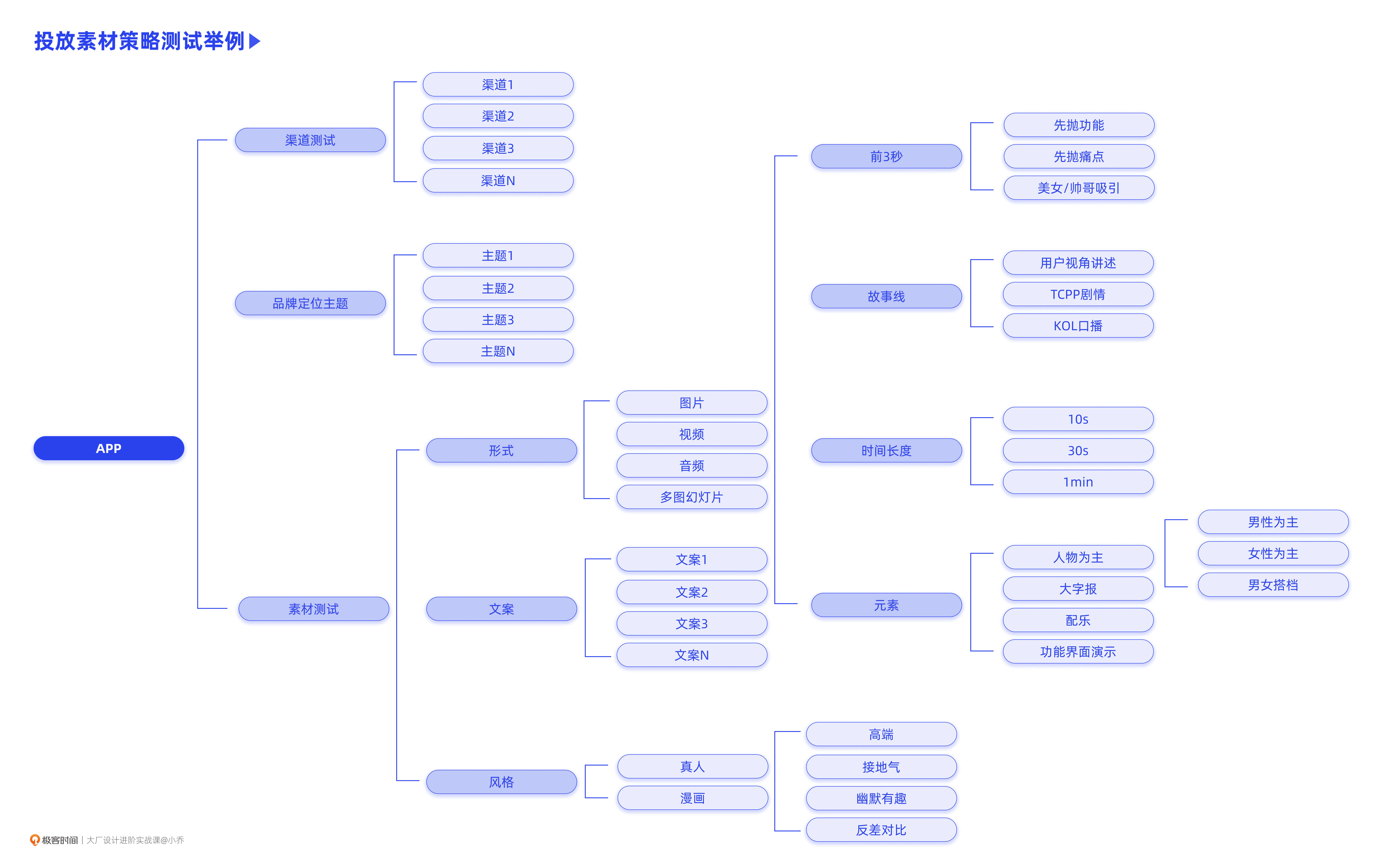 我将过往做投放素材测试的维度,整理在下图中,你可以根据自己项目的情况,制定更多维度的策略规划和测试。