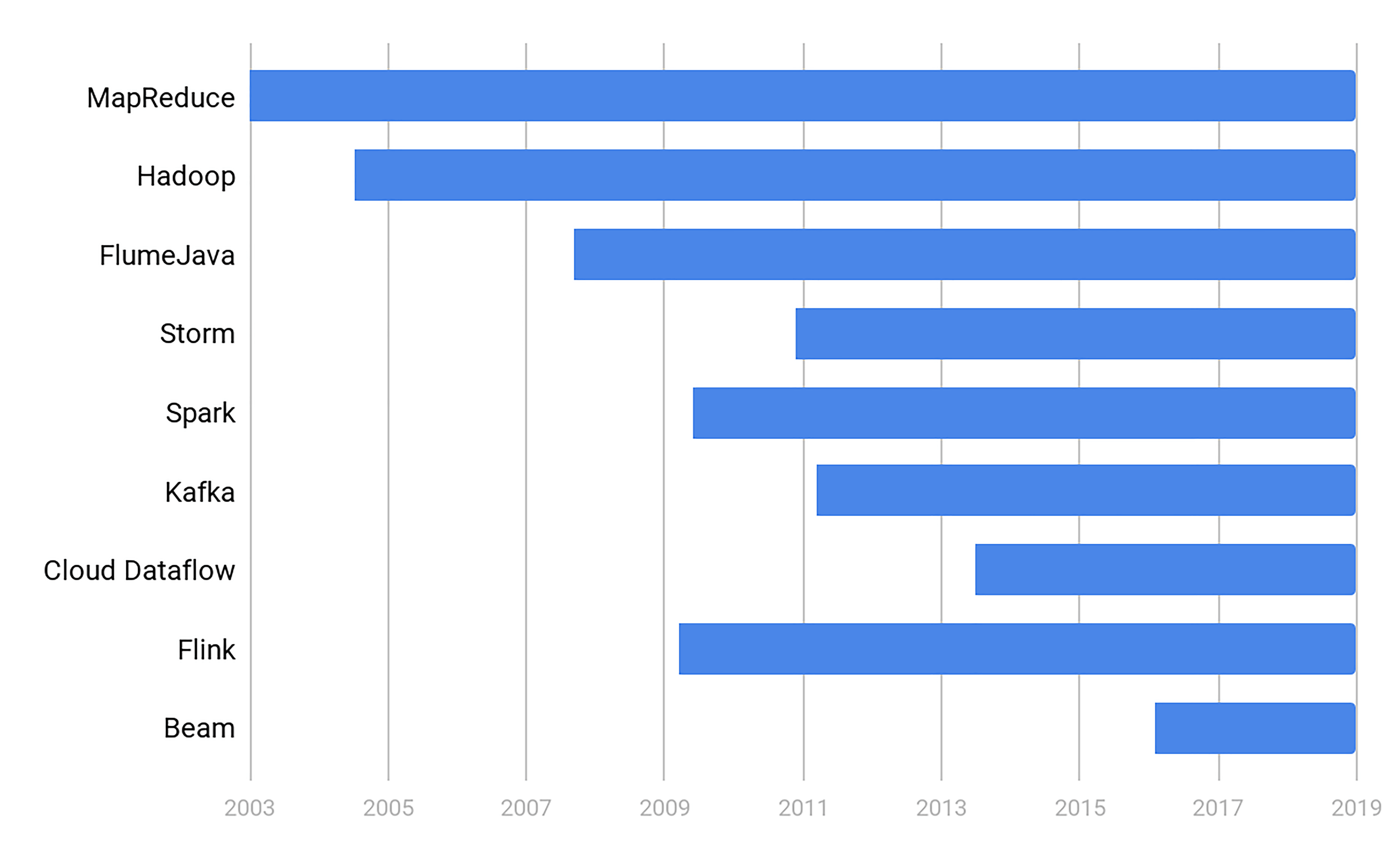 我们先来沿着时间线看一下超大规模数据处理的重要技术以及它们产生的年代。