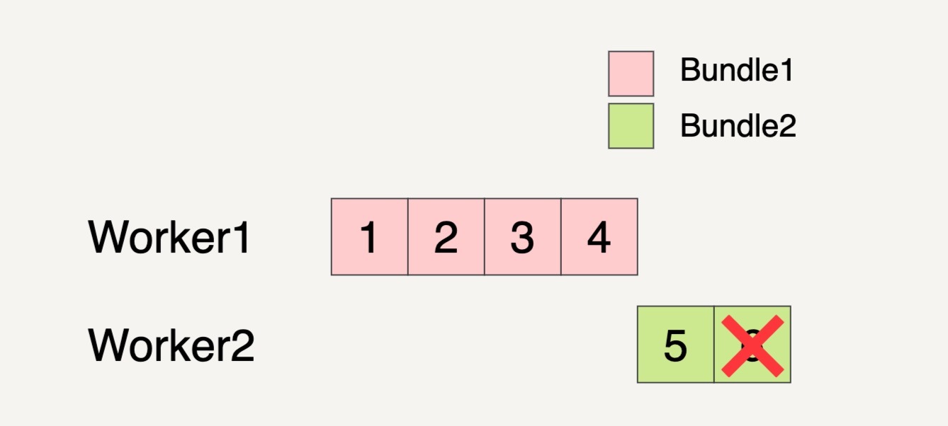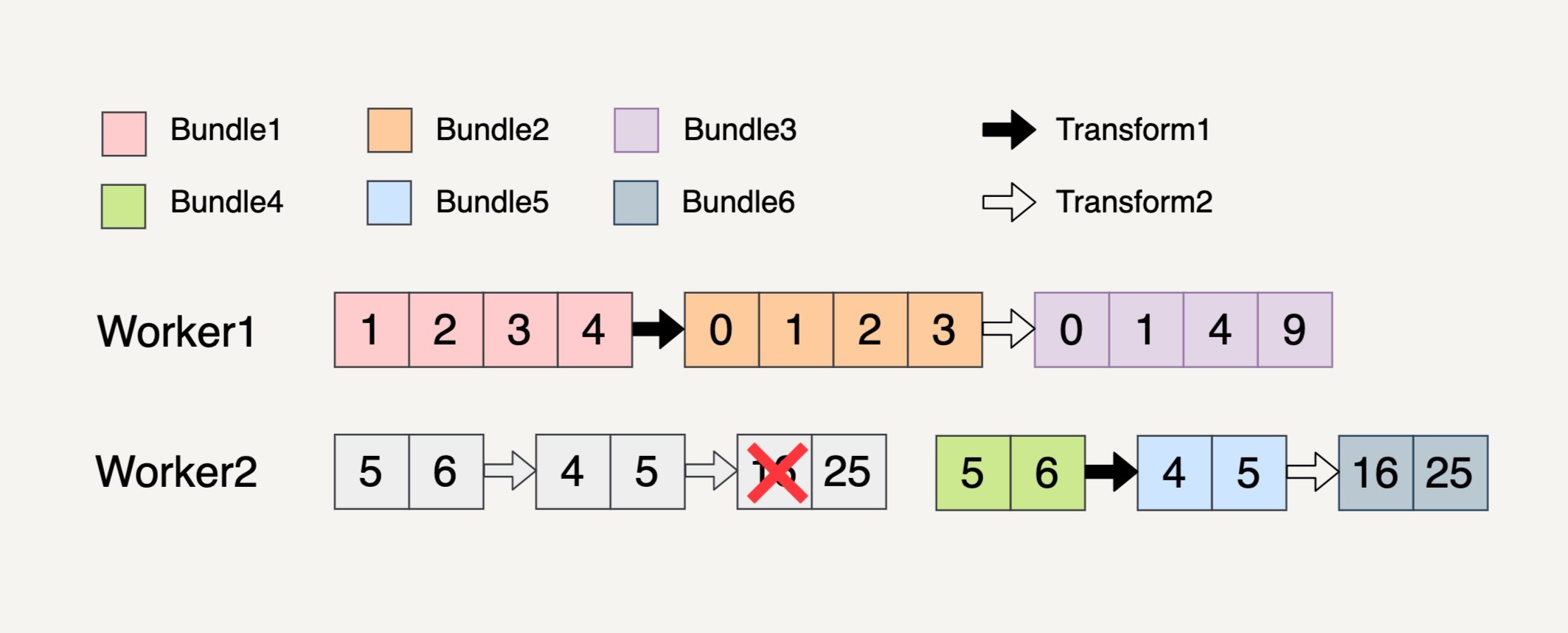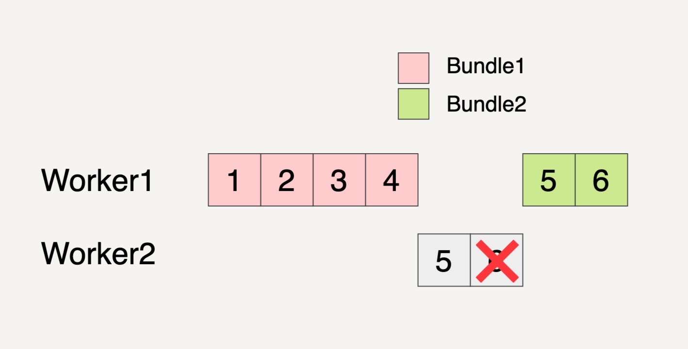 Beam数据流水线分配了两个Worker来处理这两个Bundles。我们看到下图中,在Worker2处理Bundle2的时候,最后一个元素6处理失败了。