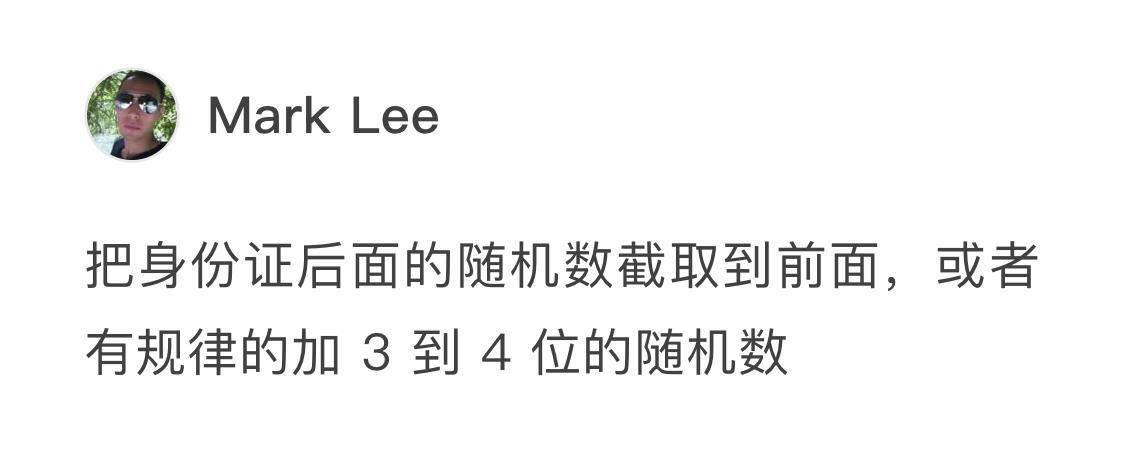 还有这位Mark Lee,他认为可以使用身份证后面的随机数来进行分片,纯技术上看起来似乎可行。但要使用用户的身份ID的话,你还需要考虑是否符合法律、道德、隐私方面的问题。