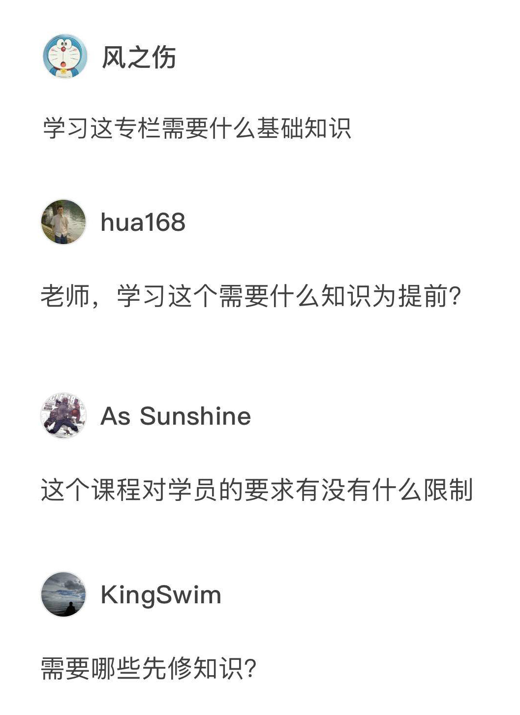 这是一个很好的问题,虽然专栏已经更新了一个月,我还是要把这个开篇词中的提问放进来。就像你看到的那样,有好几位读者都问了类似的问题。