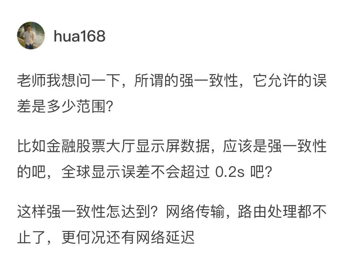 hua168同学问的是强一致性的误差范围。这个问题非常有趣,强一致性并没有误差可言的,强一致性简单地说指的就是如果更新一条数据,那所有用户读取数据的时候必须都看到这条更新了的数据。