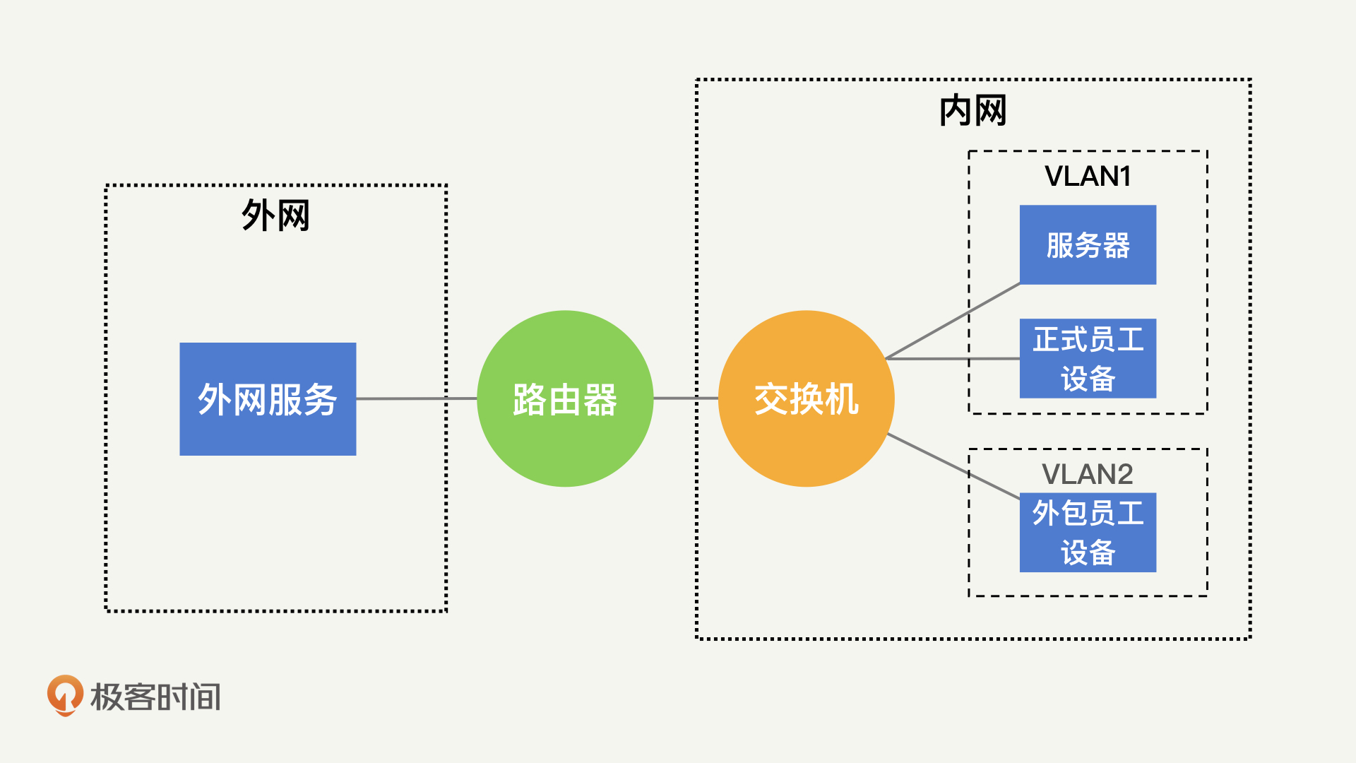 在下图中,我简单地展示了一下利用路由器和交换机对内网进行划分的效果:通过路由器划分内网和外网,通过交换机划分正式员工网络和外包员工网络。实际上,你还可以对每一个VLAN按照安全等级,进行进一步的垂直和水平划分。
