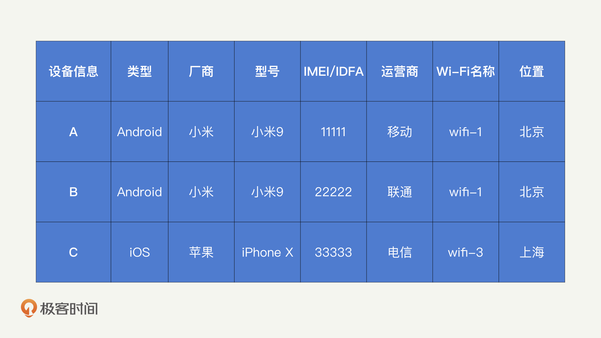 文章开头我们说过,我们要设计和实现设备指纹。那你可能会问,Android和iOS都已经内置了用来追踪设备的ID,比如IDFA(Identifier For Advertising),我们为什么还要自己去实现设备指纹呢?在解答这个问题之前,我首先来讲一下设备指纹技术面临的主要挑战。通过这些挑战,你就能够明白内置的ID存在哪些问题,为什么无法满足风控系统的需求了。