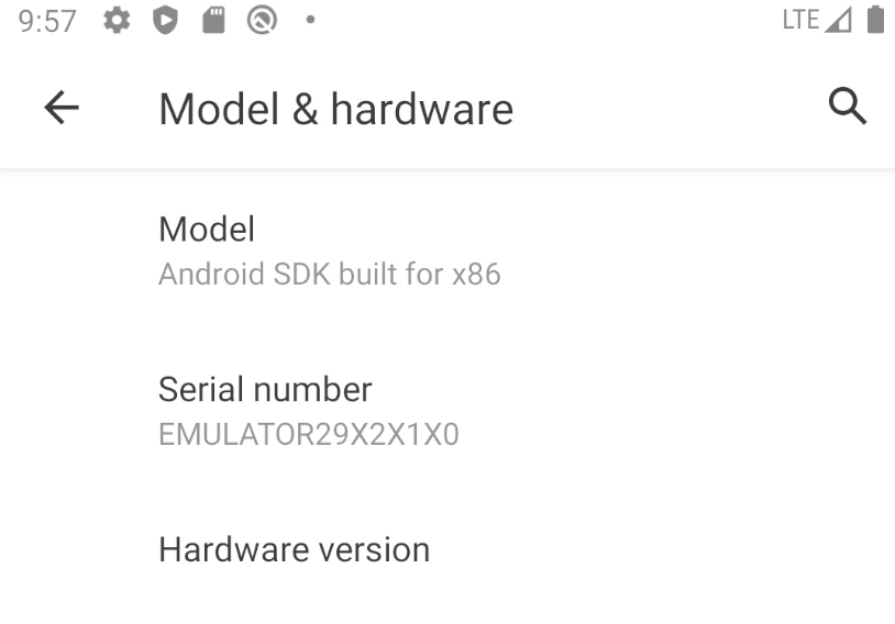 识别虚拟机最基本的方法,就是利用一些系统的默认参数,也就是系统信息来识别。下图是Android虚拟机中的部分设备信息,可以看到设备型号是x86(市面上不存在x86的安卓手机),序列号是EMULATOR开头。
