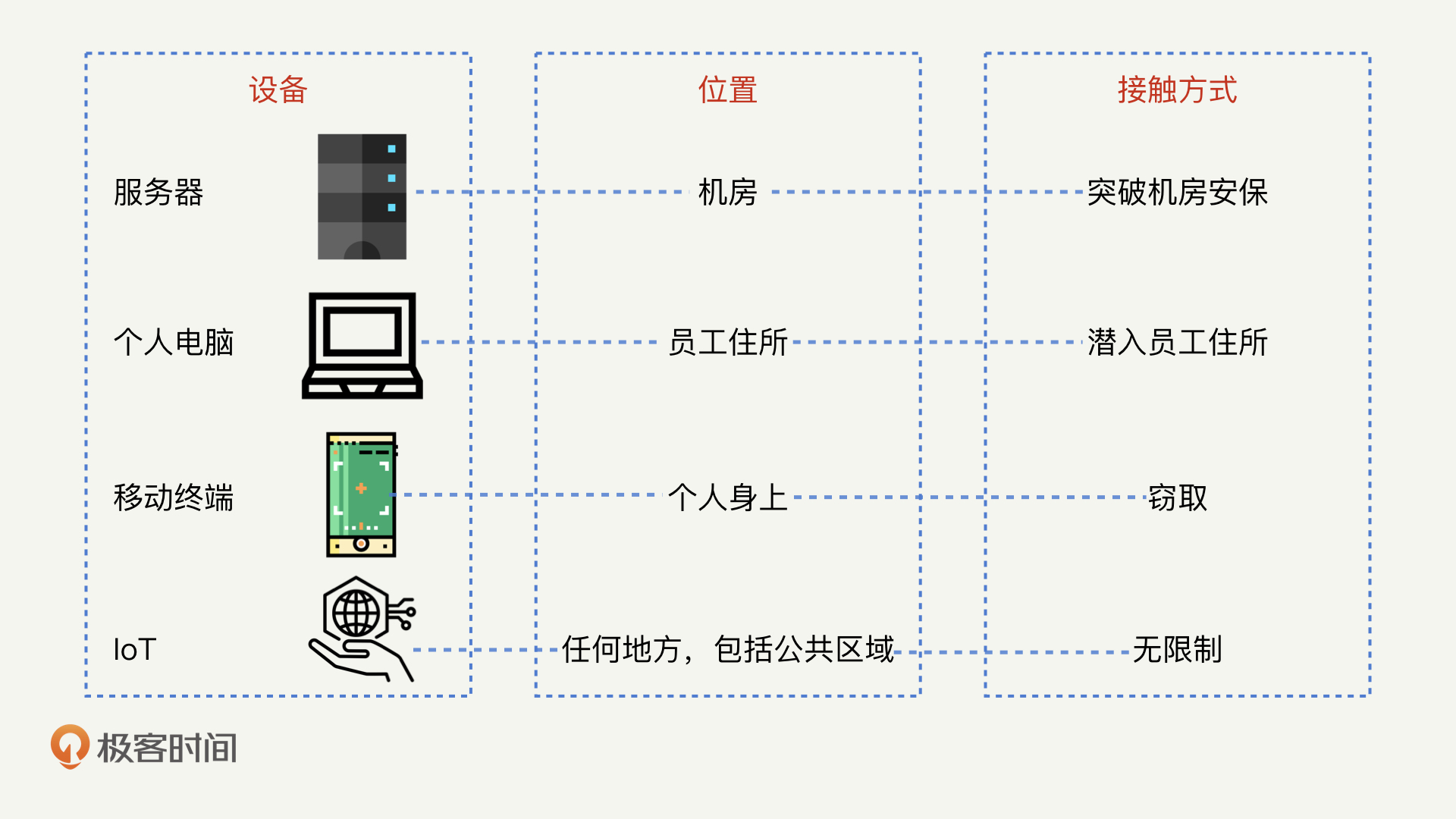 IoT的发展,事实上正让物理攻击变得越来越容易。我总结了一张物理攻击的发展过程图,你可以看到,随着IoT越来越小、越来越智能,和我们的联系越来越紧密,物理攻击的难度也变得越来越低。在未来,公共区域内的所有设备甚至都有可以成为黑客的囊中之物。