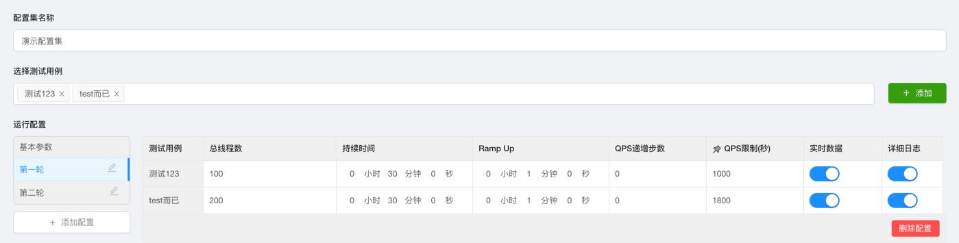 配置集功能的本质是“批量运行多个测试用例”,如下图所示,用户只需提前在配置集中添加需要执行的测试用例,以及每个执行轮次的配置信息,比如线程数、持续时间等。配置集设定完成后,选择某个轮次,就能基于相应的配置一键触发所有测试用例。