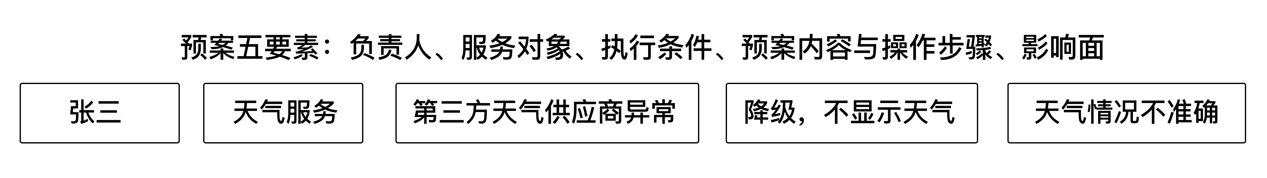 预案编写应非常具体,避免歧义,还要落实到具体的人。我国对应急预案制定有国家标准,在互联网行业我们可以简化一下,将预案组织为:负责人、服务对象、执行条件、预案内容与操作步骤、影响面等五大要素。下面是一个双11活动期间我们的预案实例,张三所负责的天气服务基于的是第三方天气供应商提供的数据,如果供应商服务出现异常,可以操作降级,效果是不显示天气,用户无法获取准确的天气信息。