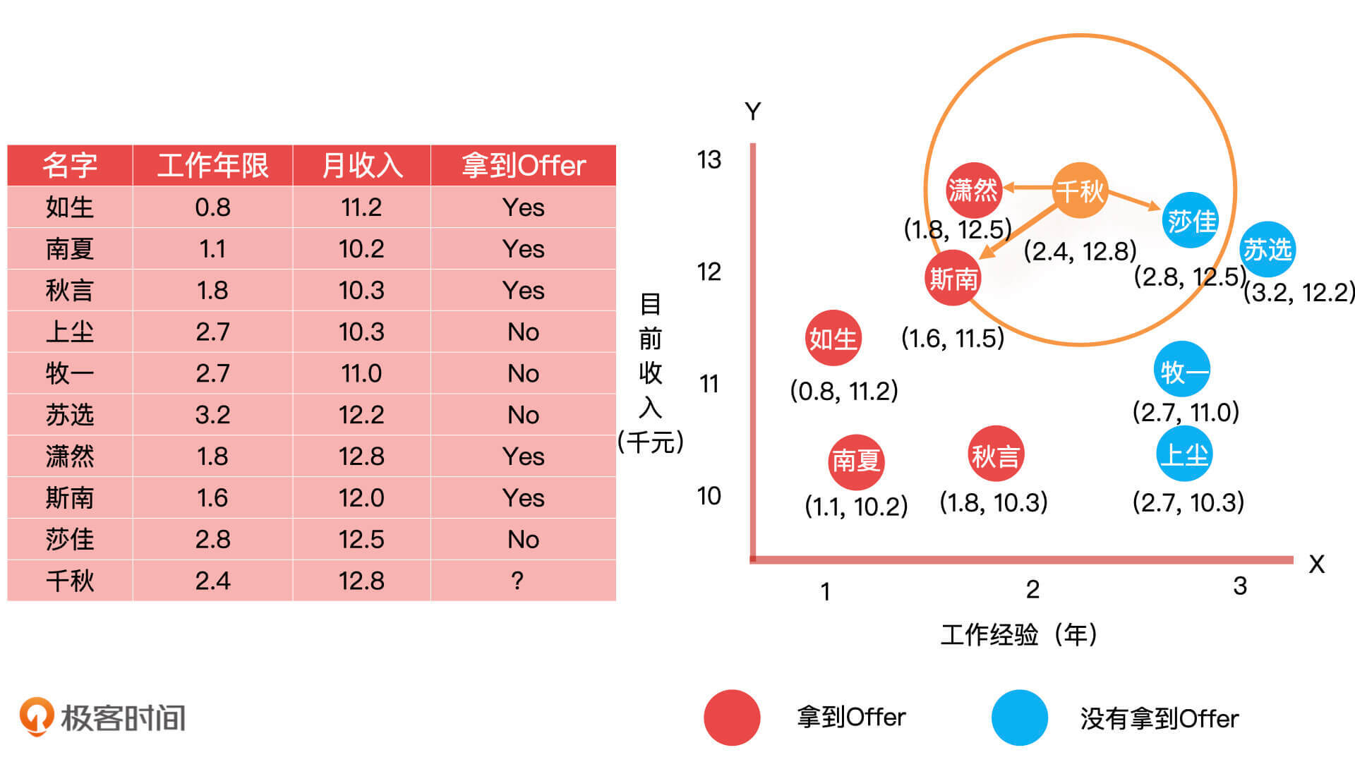 比如说,在这份数据中,我在千秋同学的附近,选出距离他最近的 3 个人,分别是潇然同学、斯南同学和莎佳同学。这三人中,潇然和斯南同学都拿到了 Offer,莎佳同学没拿到 Offer。这样一来,我们就可以直接预测出千秋同学是可以拿到 Offer 的,因为距离最近的三个人当中,拿到 Offer 的人数大于没有拿到 Offer 的人数,或者说“少数服从多数”。