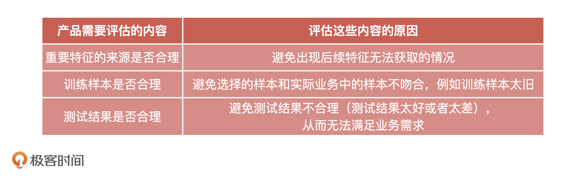 第二,容易导致评估范围不完整。产品上线之后验收,大家很自然就会更加关注业务指标,容易忽略模型本身的指标,比如在上面的例子中,我们只关注模型性能表现但没有去评估模型特征的稳定性,特征一旦失效就让整个产品出现了问题。