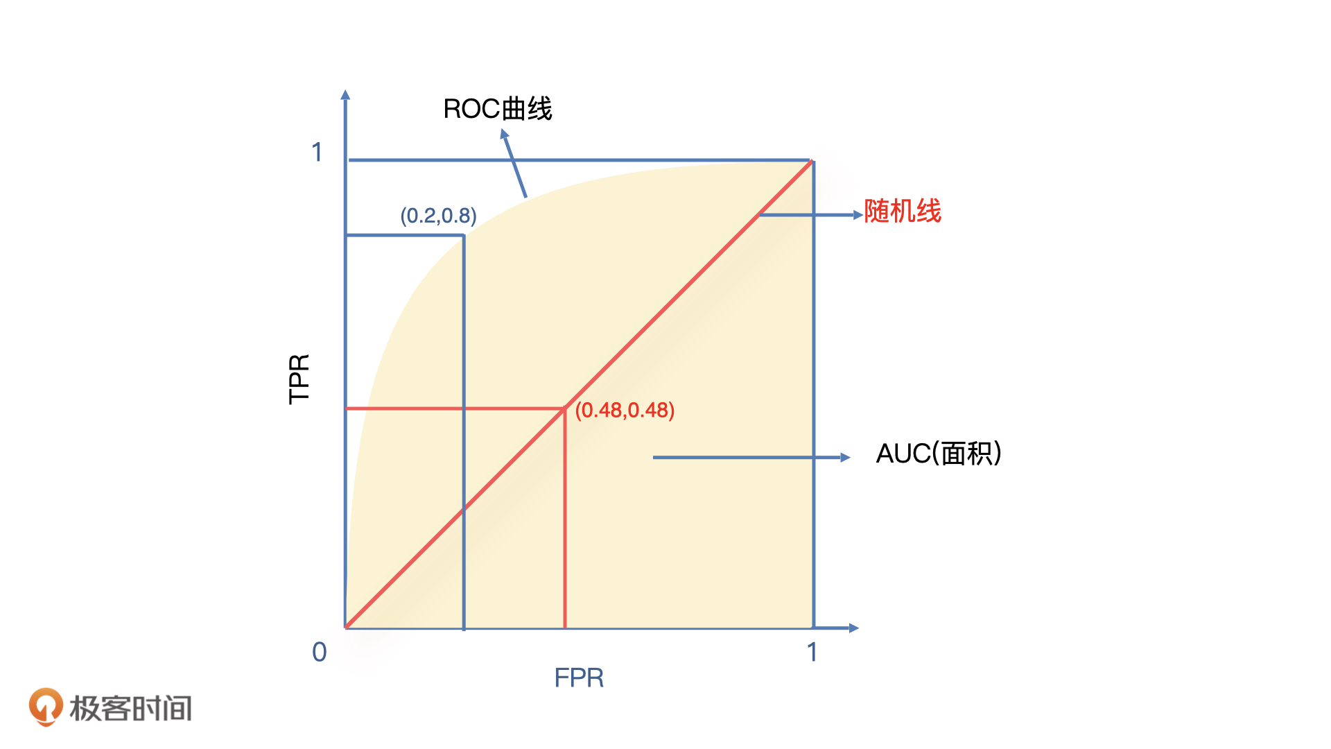 因此我们想到,是不是可以把曲线右下方和横坐标轴闭合起来的面积作为一个评估指标。这个面积就是我们图上蓝色的阴影部分,它就是AUC指标。一般来说AUC都在0.5到1之间,AUC越高代表模型的区分能力越好。如果AUC=0.5,那ROC曲线与图中红线重合,表示模型没有区分能力,它的结果等于随机猜测;如果AUC小于0.5,说明这个模型大概率很差。
