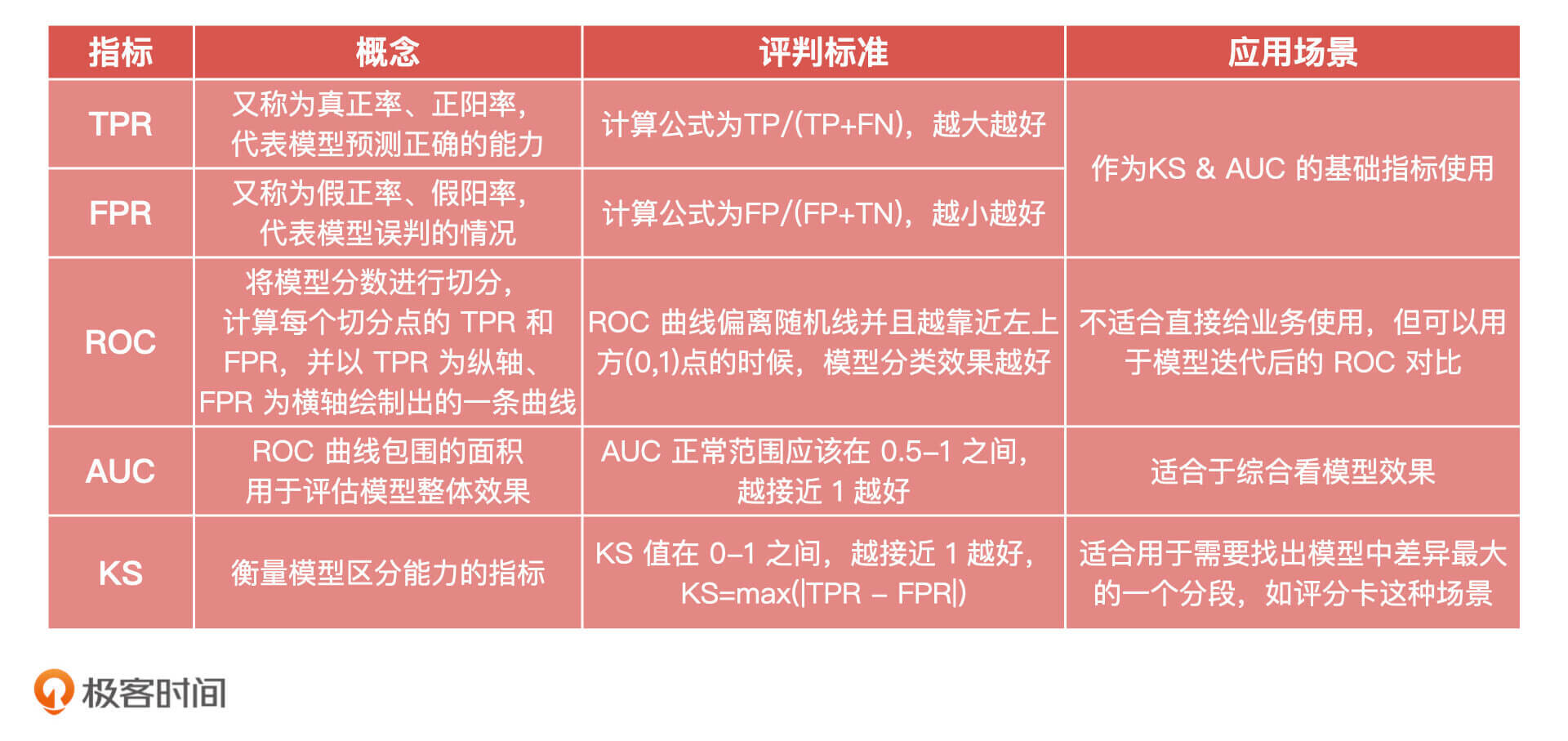 这节课,我们讲了分类模型评估的进阶指标:KS和AUC,它们是我们在模型评估中用得比较多的指标。围绕它们的构建,我们又讲了TPR、FPR和ROC曲线,为了方便你记忆和对比,我把它们的核心概念、公式适用场景都总结在了下面的表格中,你可以看看。