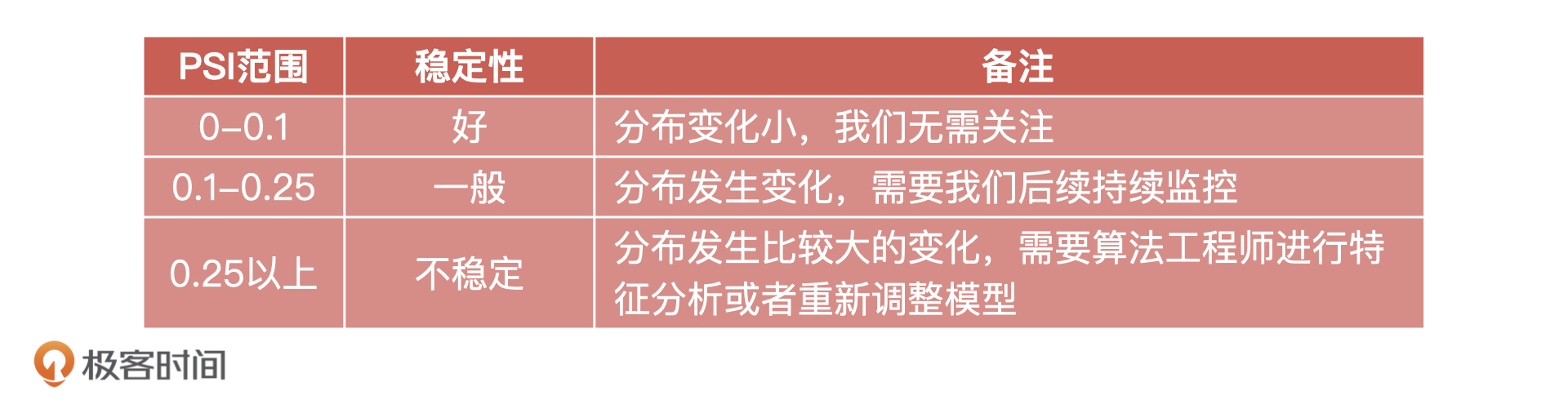 在业务层面,PSI 数值越小说明两个分布之间的差异也就越小,也就代表模型越稳定。更具体一点,我们一般会这么定义模型的稳定性: