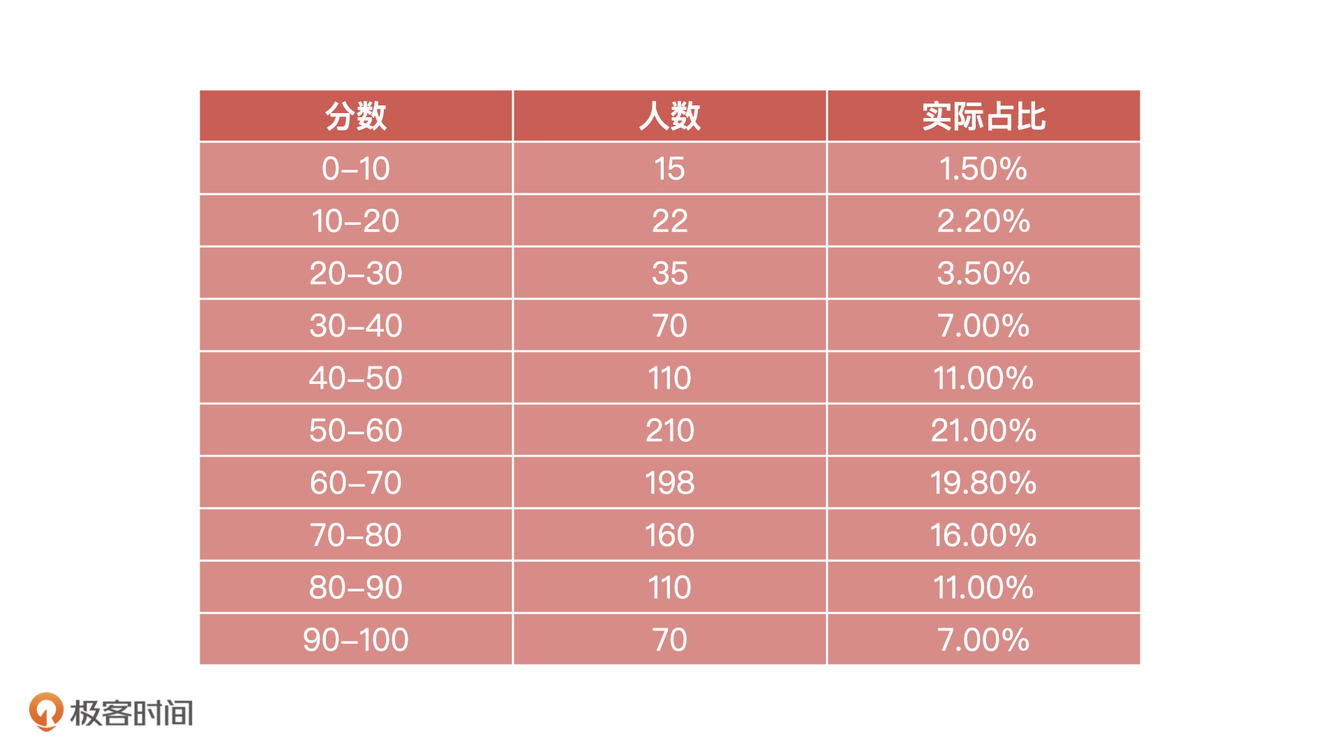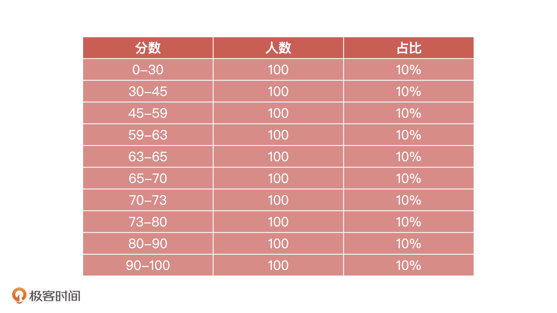 那么,什么是等频分箱和等距分箱呢?所谓等频分箱是指每个分箱中的样本数量相等,分数段不同,并且分数段是根据人数占比计算得到的。比如,对于把信用评分的结果,我们使用等频分箱的方式可以把它们分为 10 个箱子。其中,每个箱子分数段不同,但是里面的人数相同,示例如下: