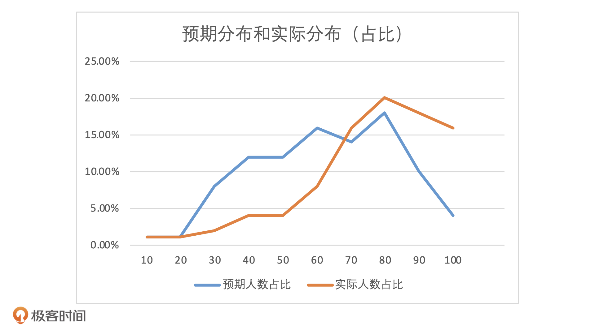 在产品验收阶段,我会使用模型上线时的 OOT 样本作为预期样本,非 OOT 时段的近期抽样样本作为实际样本。不仅产品经理,算法工程师也需要对模型的稳定性进行评估,他们通常会在模型验收之前,使用验证样本作为实际分布,使用训练样本作为预期分布,这一点你知道就可以了。