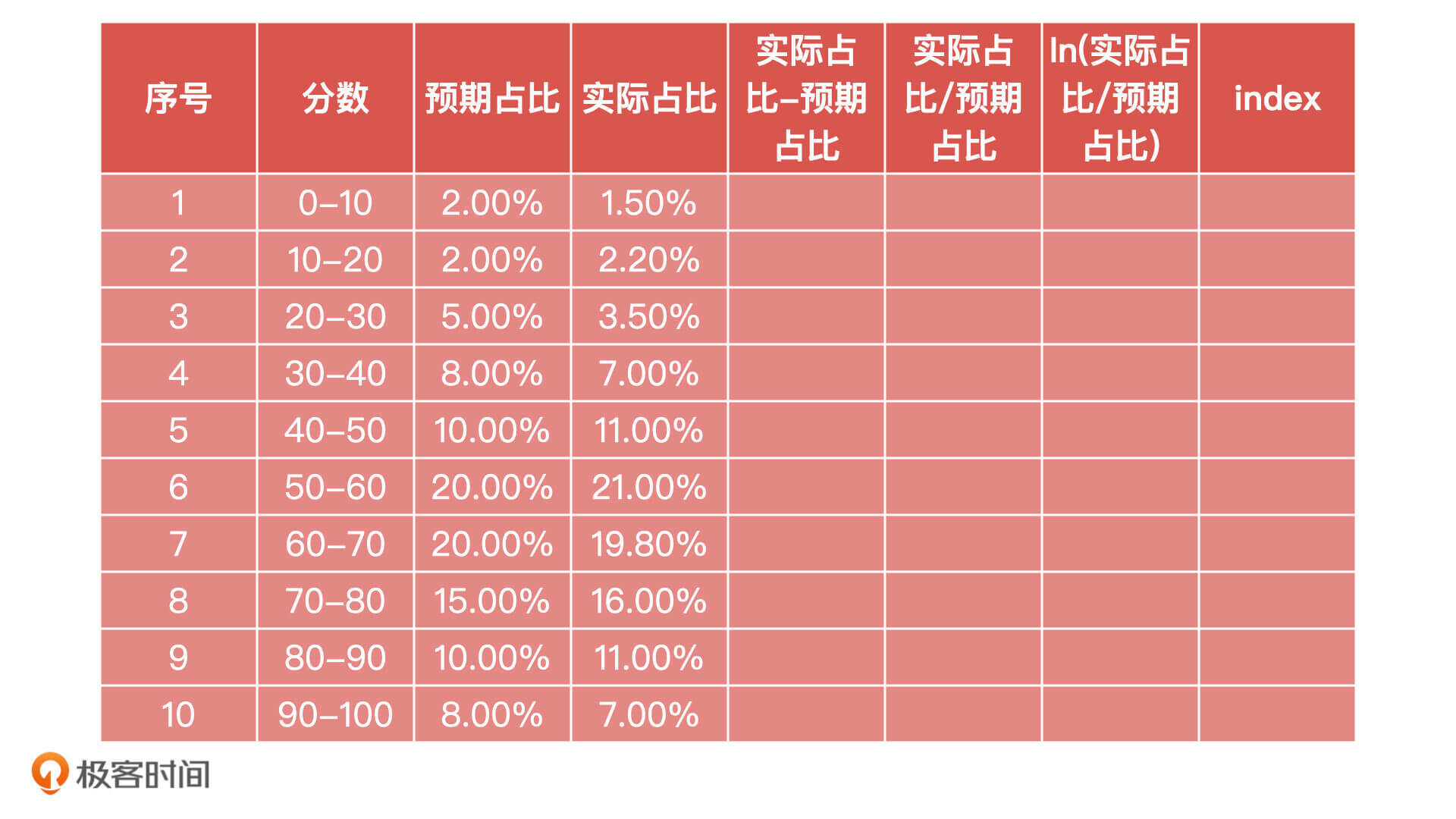 PSI 的计算过程非常简单,在工作中我们也不需要手工去计算 PSI,通过 Python 代码就可以直接计算。今天,我希望你能通过它的计算过程深入理解它的原理。