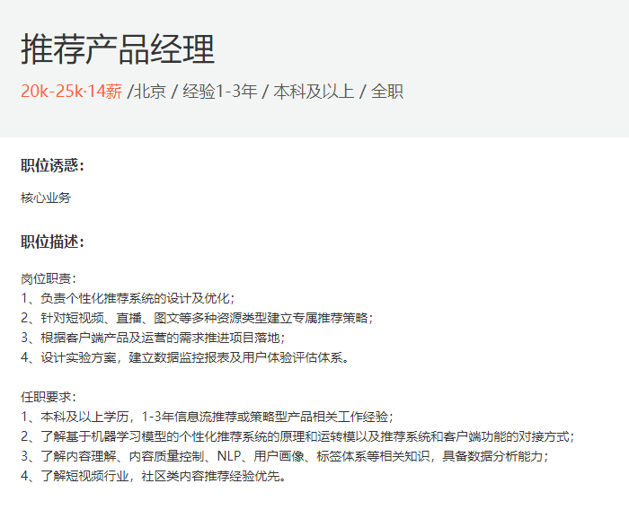 关于岗位,无论你要转型成为哪类产品经理,都要时刻关注目前互联网公司中的招聘。对于推荐产品岗位,除了要知道我们今天讲的内容,你还要注重积累推荐策略、推荐效果数据分析,以及产品的优化升级方面的经验。我在下面列举了一个市场上推荐产品经理的 JD,你可以参考下。