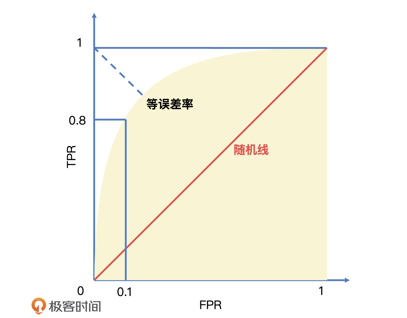 我们先来看求得的ROC曲线,它的横轴为 FPR,FPR 越大表示预测正类中实际负类越多。它的纵轴为 TPR,TPR 越大表示预测正类中实际正类越多。我们理想的目标肯定是 TPR = 1、FPR = 0,即图中 (0, 1) 点,所以 ROC 曲线越靠拢 (0, 1) 点,越偏离 45° 对角线,它的效果就越好。