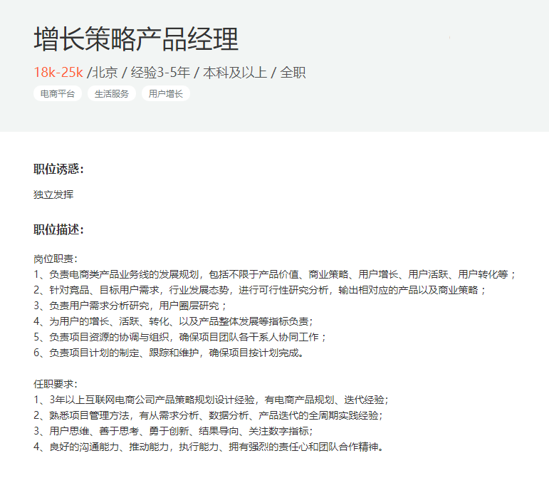 关于岗位:构建复购预测模型一般是对增长产品经理的岗位要求,比如增长策略产品经理。增长策略的核心就是做用户运营,所以,如果你想要从事这方面的工作,那除了我今天讲的产品经理必备的知识以外,用户运营方面的知识你也要去了解。我在下面给出了一个增长策略产品经理的JD,你可以作为参考。-
