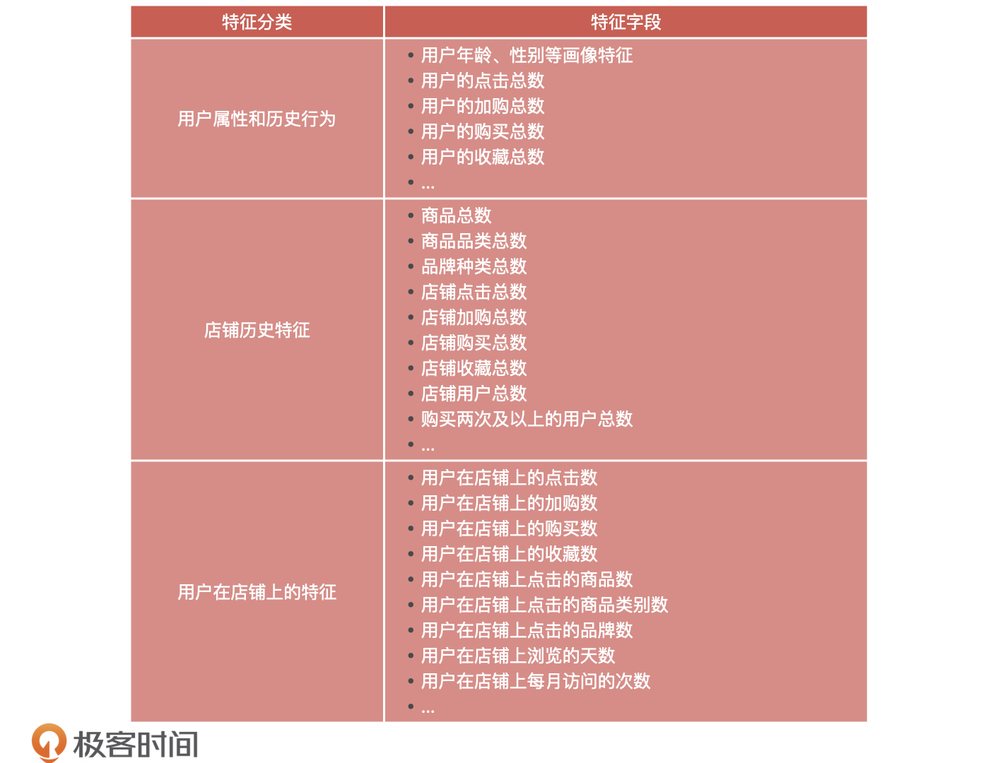 最终,在复购模型的特征构建中,基于统计次数的特征提取,我们至少能提取出如下表中这些特征信息: