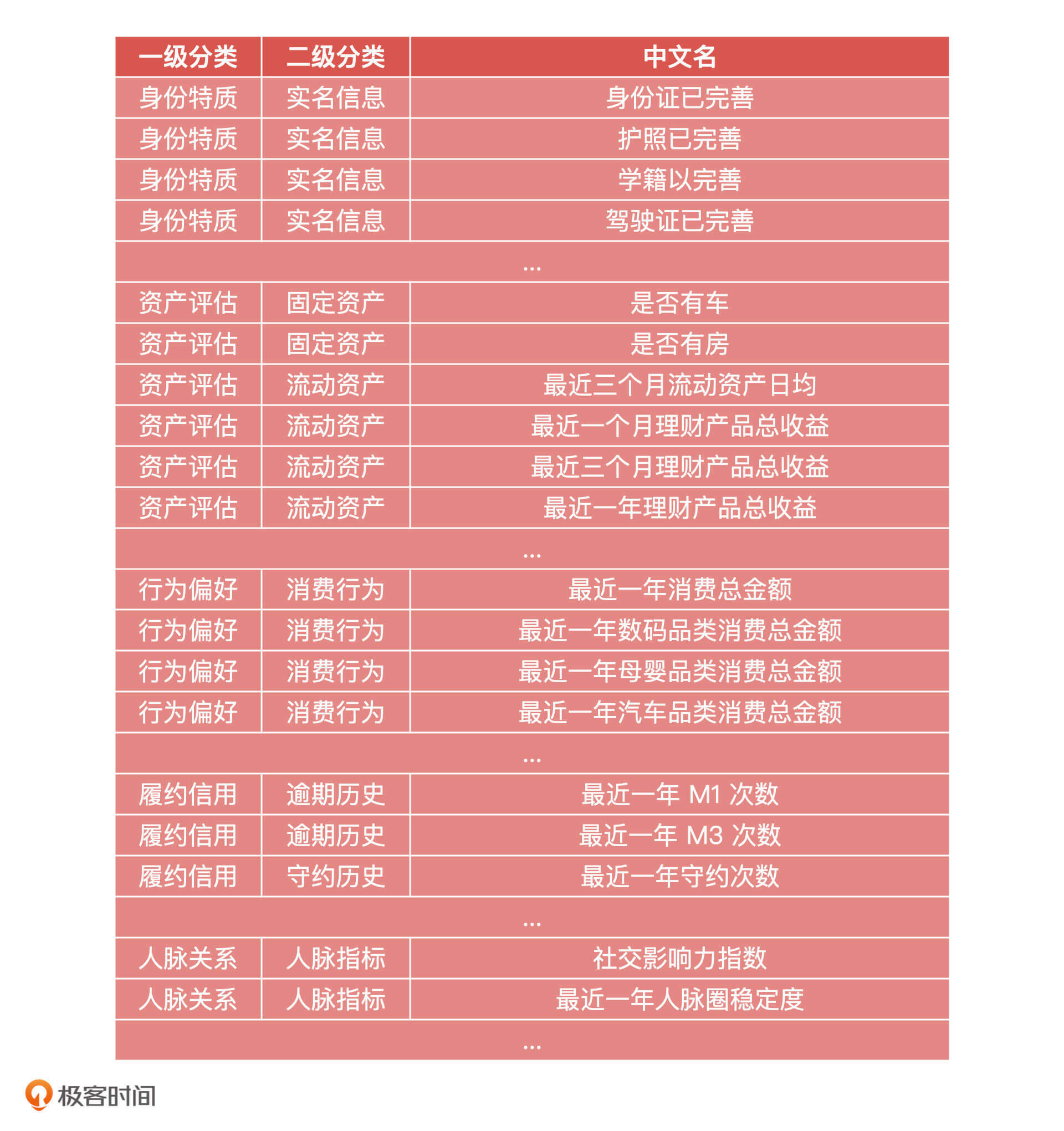 原始数据就是存储在业务系统中的基础字段,比如日交易额、下单量、点击或搜索次数等原始字段信息。扩展数据是原始数据加工转化后的数据,一般有三种生成方式:按照时间维度衍生,如最近 1 个月或者 3 个月交易额;通过函数衍生,如最大或最小交易额,以及交易额方差;通过比率衍生,如“最近 1 个月交易额/最近 3 个月交易额”。