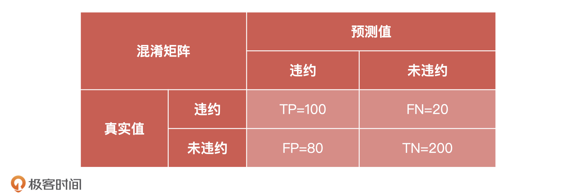 • 模型的召回率的计算是:\(\\frac{TP}{TP+FN} = \\frac{100}{100 + 20} = 0.83\)