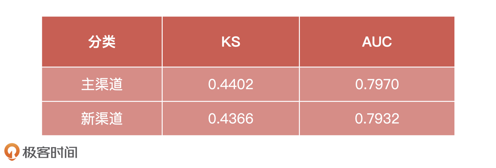 从验证集表现上来看,虽然从模型效果上来说“主渠道”>“新渠道”,但两个模型的KS和AUC值相差不大。由此,我们可以推测出以下2个结论: