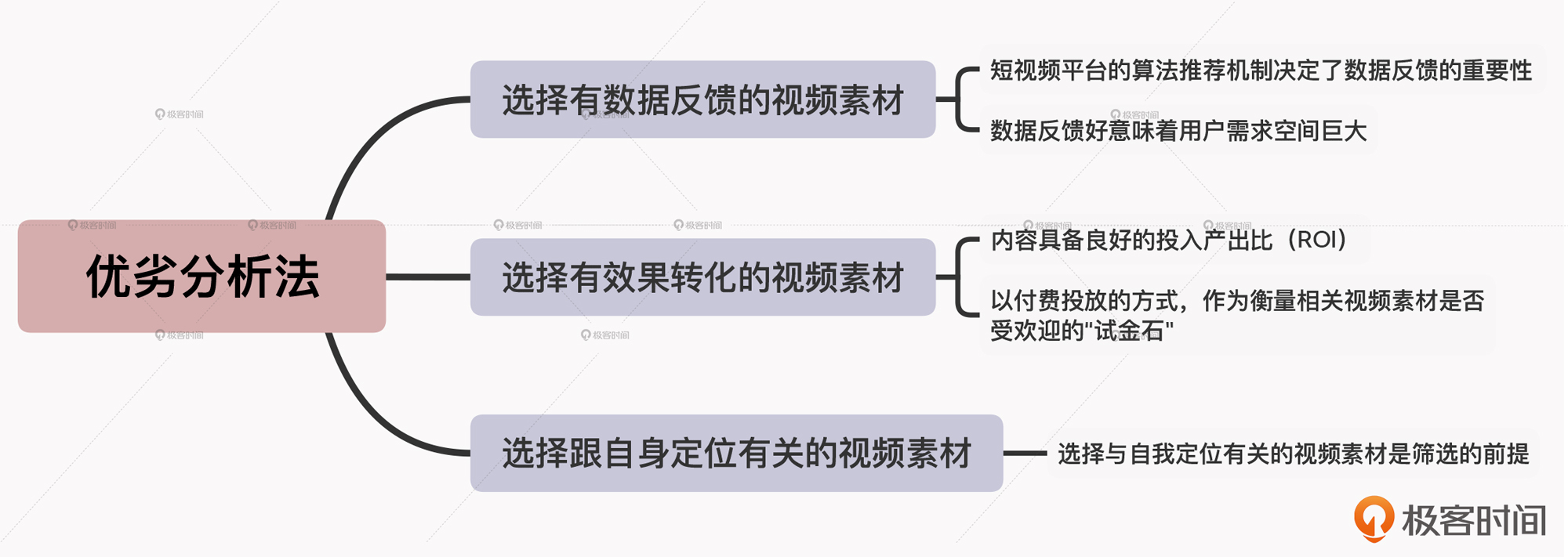 因此,根据优劣分析法的不同表现,我把视频素材的筛选方法划分为了三种,分别是数据反馈、效果转化、自身定位,下面我们就来看看这三种方法。