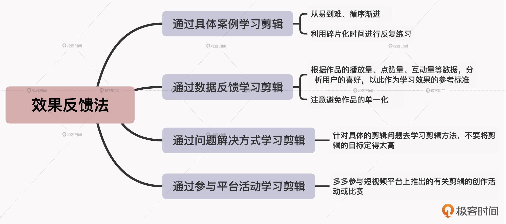 答案就是接下来我要给你分享的四种应用方法,分别是通过具体案例、通过数据反馈、通过问题解决方式、通过参与平台活动来学习剪辑,以此更好地掌握效果反馈法的学习精髓。