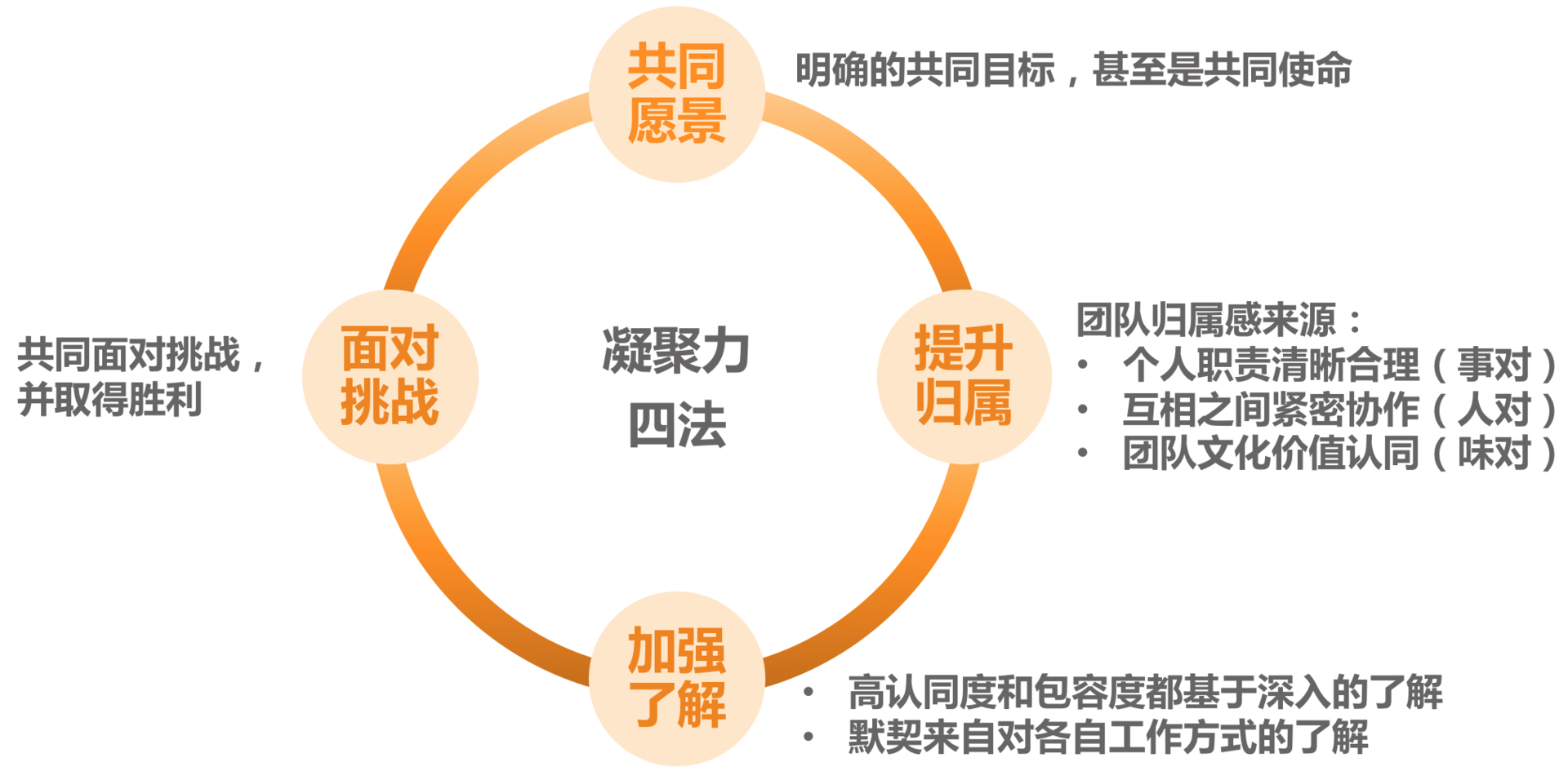 好了,关于提升团队凝聚力的四个方面的工作,我们可归结为如下: